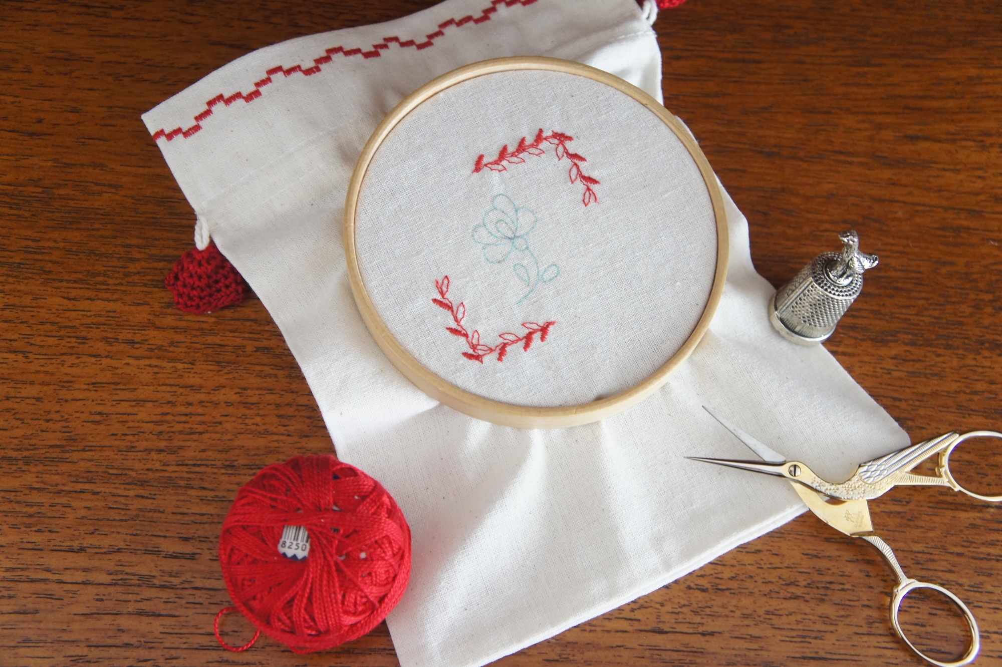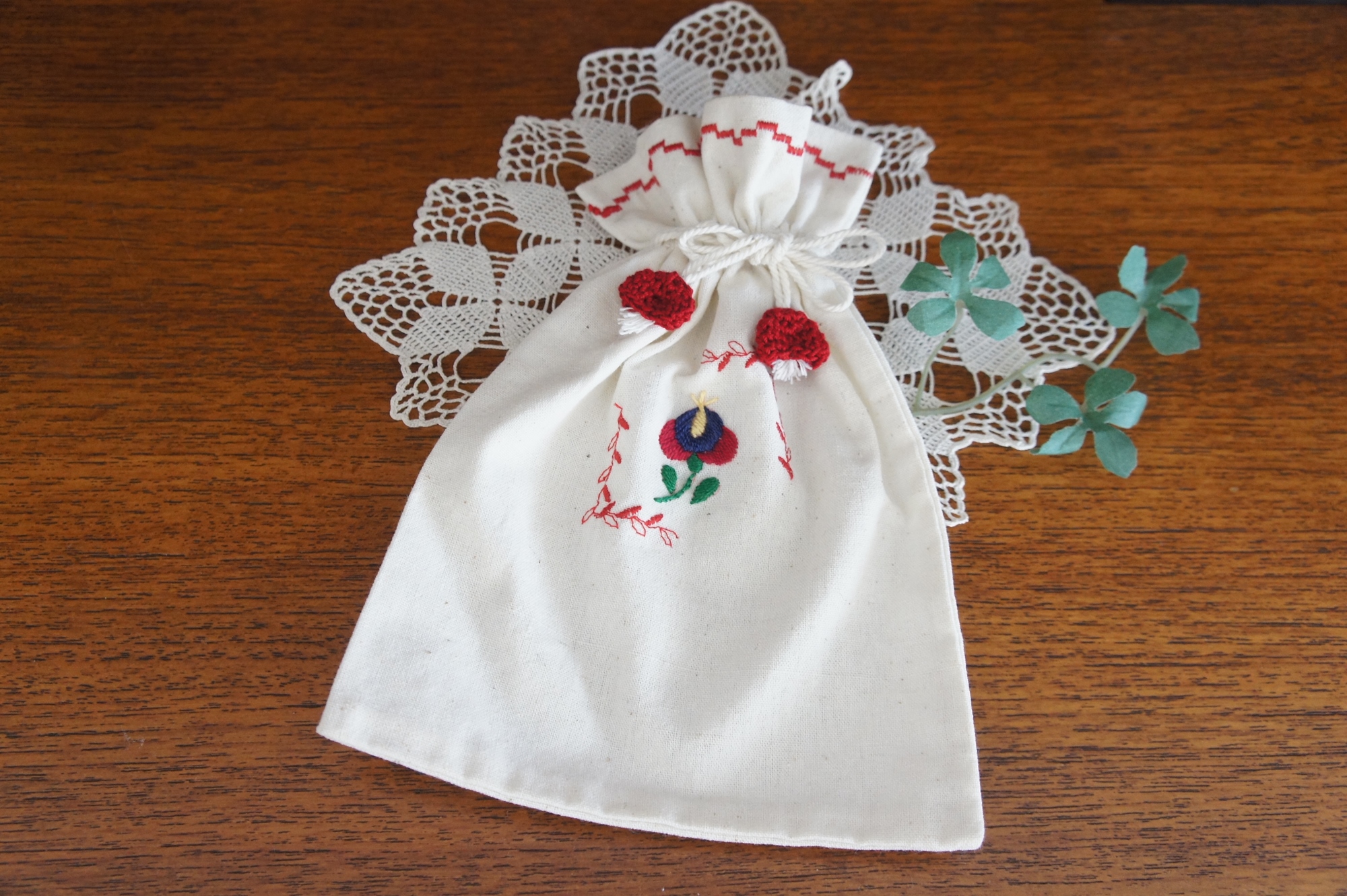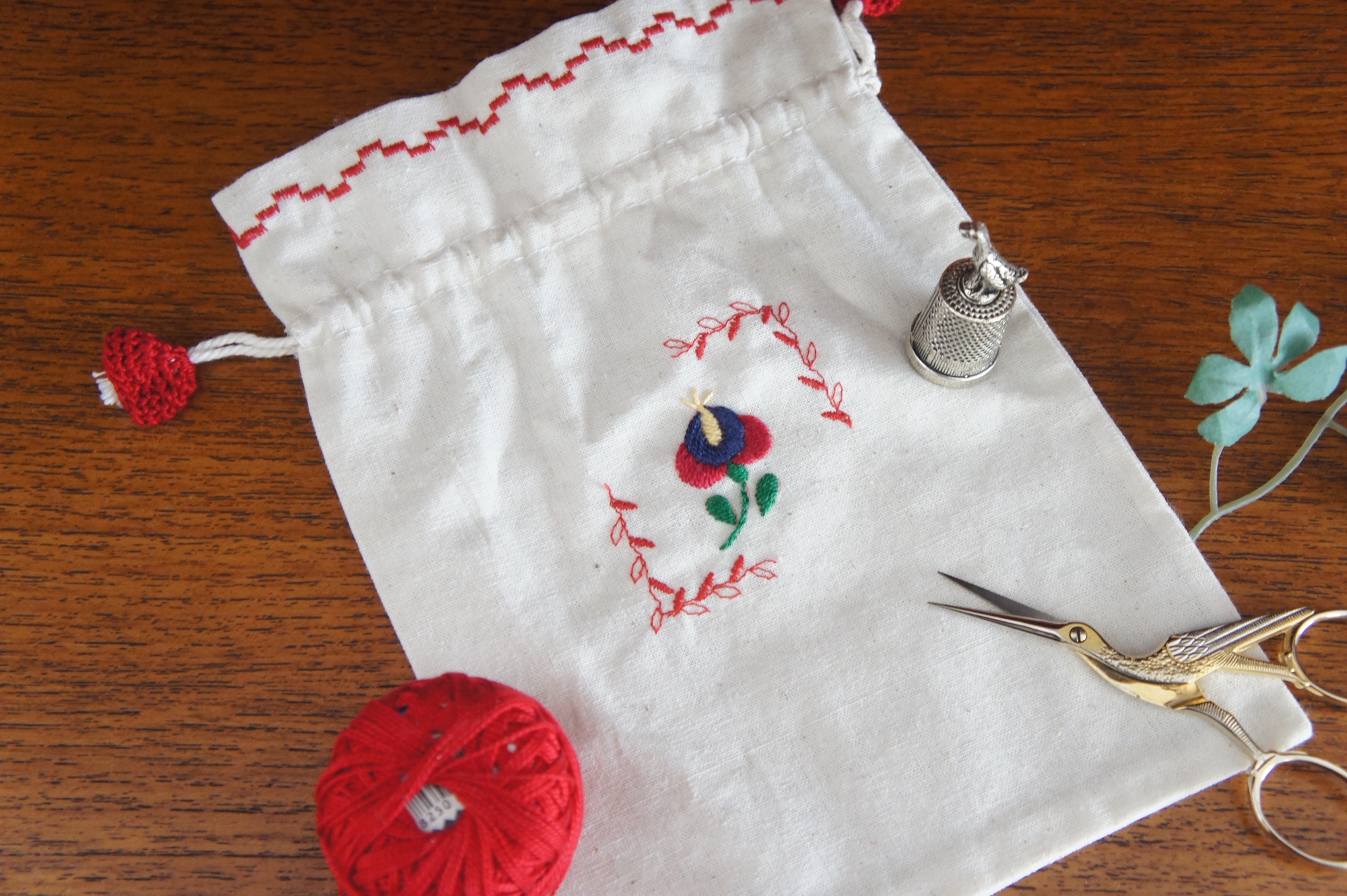 在手袋(長23cm×寬18cm)上使用刺繡的技法完成小花刺繡。