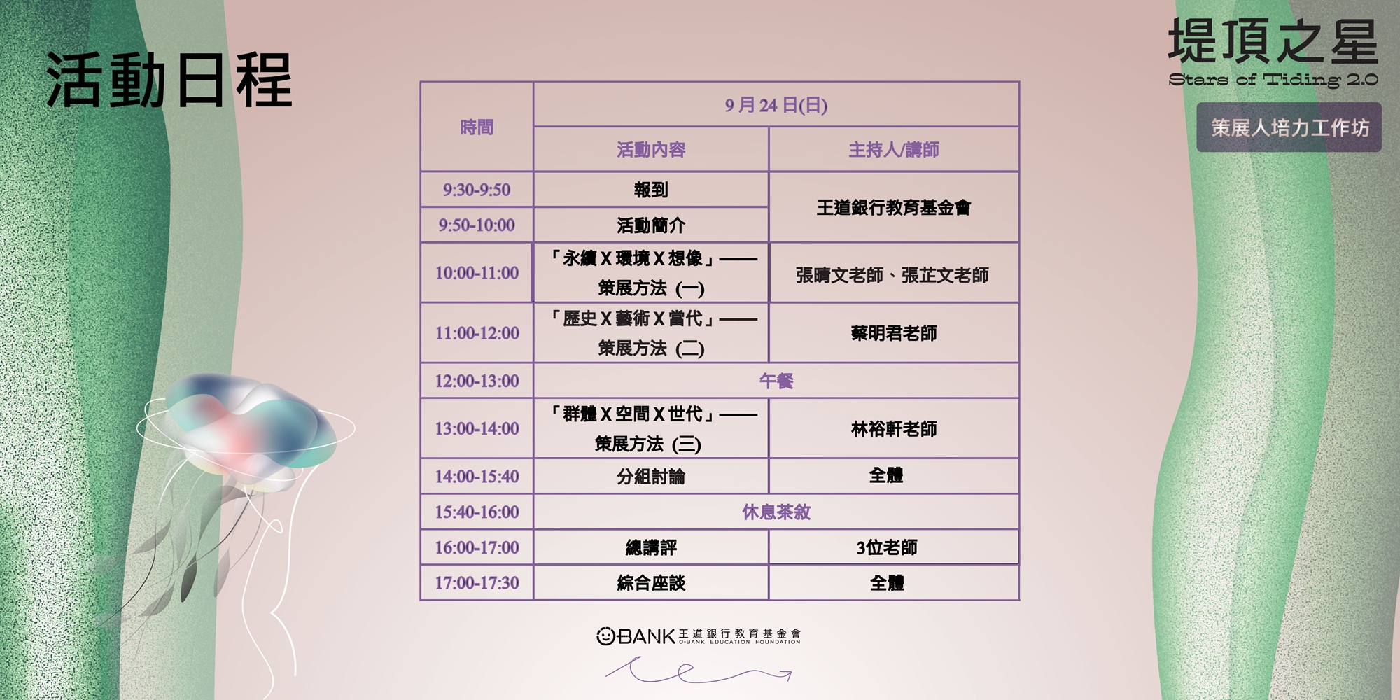 財團法人王道銀行教育基金會『堤頂之星2.0』視覺藝術展覽補助計畫徵件,由國立清華大學藝術與設計學系張晴文 副教授擔任2024年度策展人,年度主題為「永續X環境X想像」,並舉辦「策展人培力工作坊」。