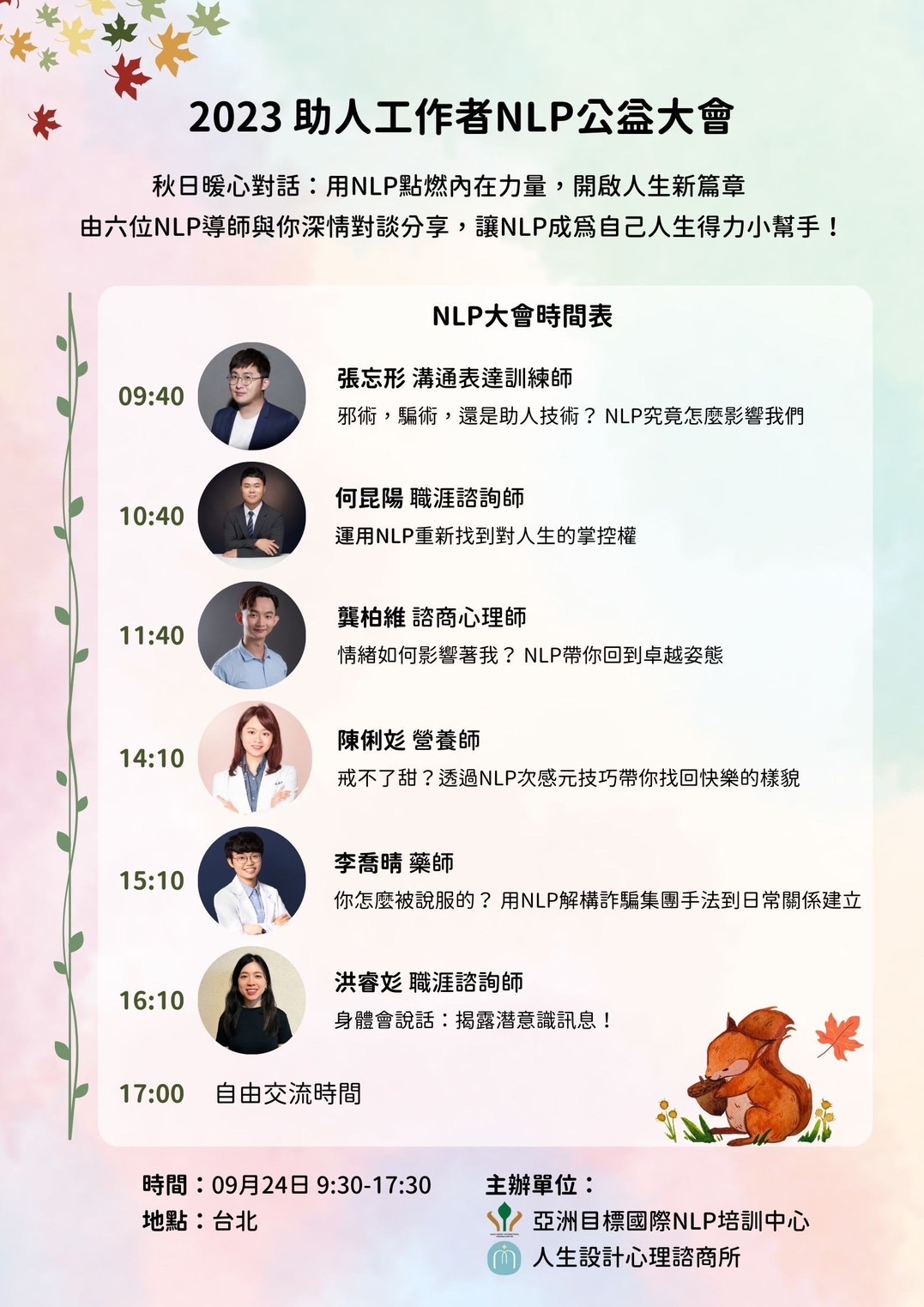 希望在一天的時間中,透過六位NLP導師與你對談分享,透過各種的體驗,讓你感受NLP的各種可能性,點燃內在力量,開啟人生新篇章!