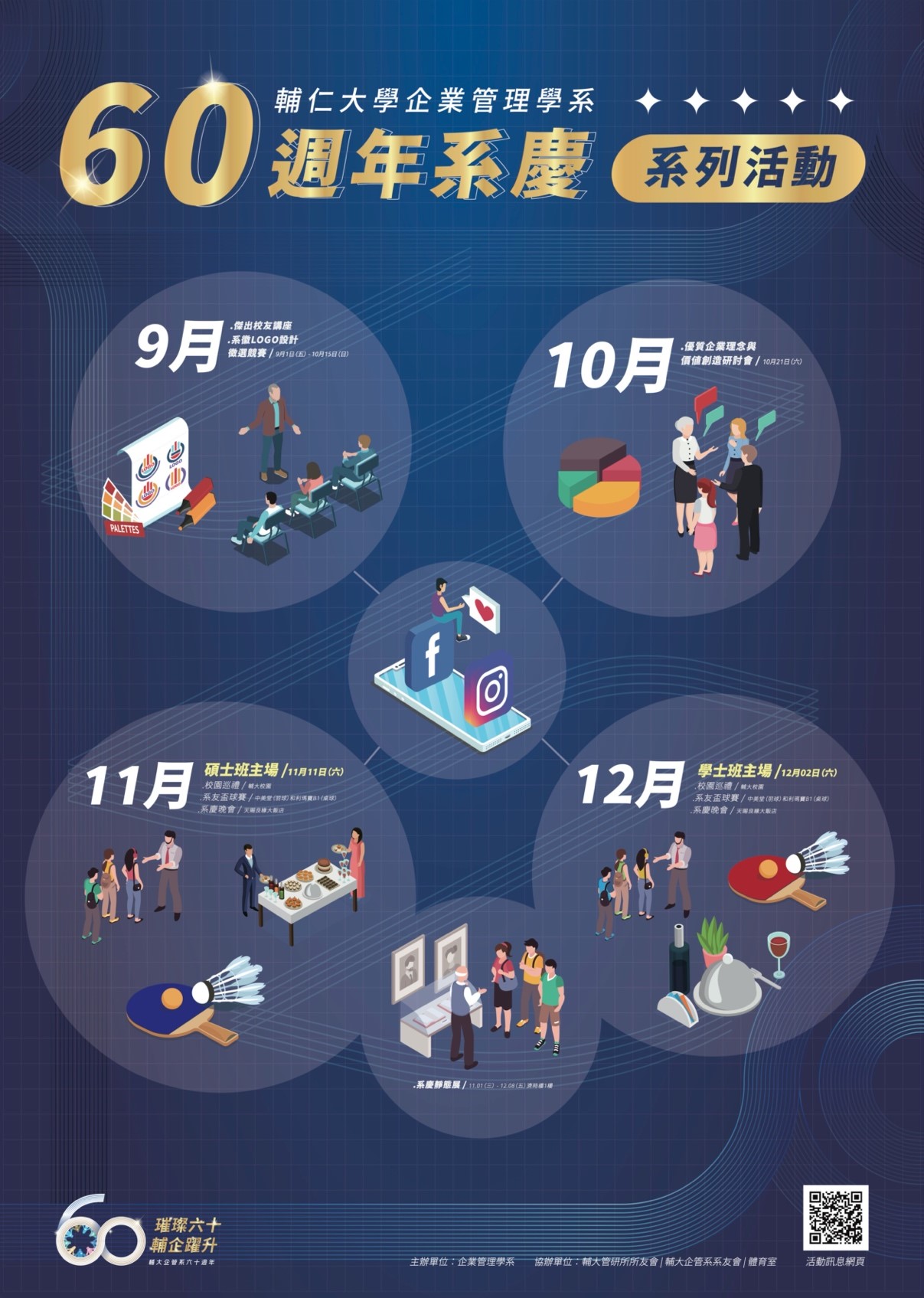 由於60週年是企管系重要的節日,自9月起至12月,我們將舉辦多項「實體活動」😍,歡迎各位系友撥冗回輔大參加各月份的專屬活動,歡迎企管系學士班、進修學制、碩士班、碩士在職專班的系友們,一起回母校,回憶、話當年,同時見證母系一甲子來的成長!