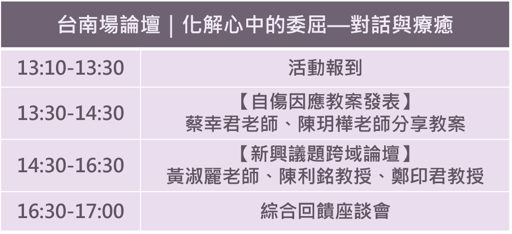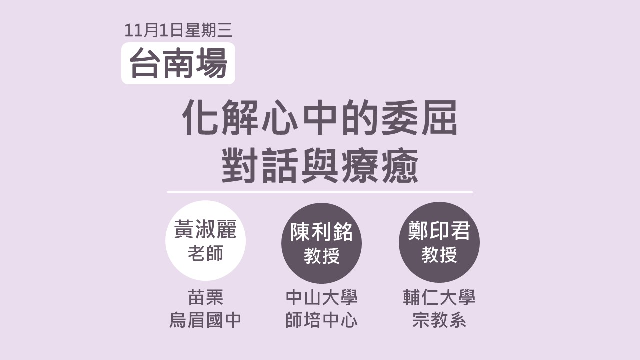 【台南場】生命教育新興議題探究論壇|化解心中的委屈:對話與療癒(歡迎一般民眾踴躍報名)