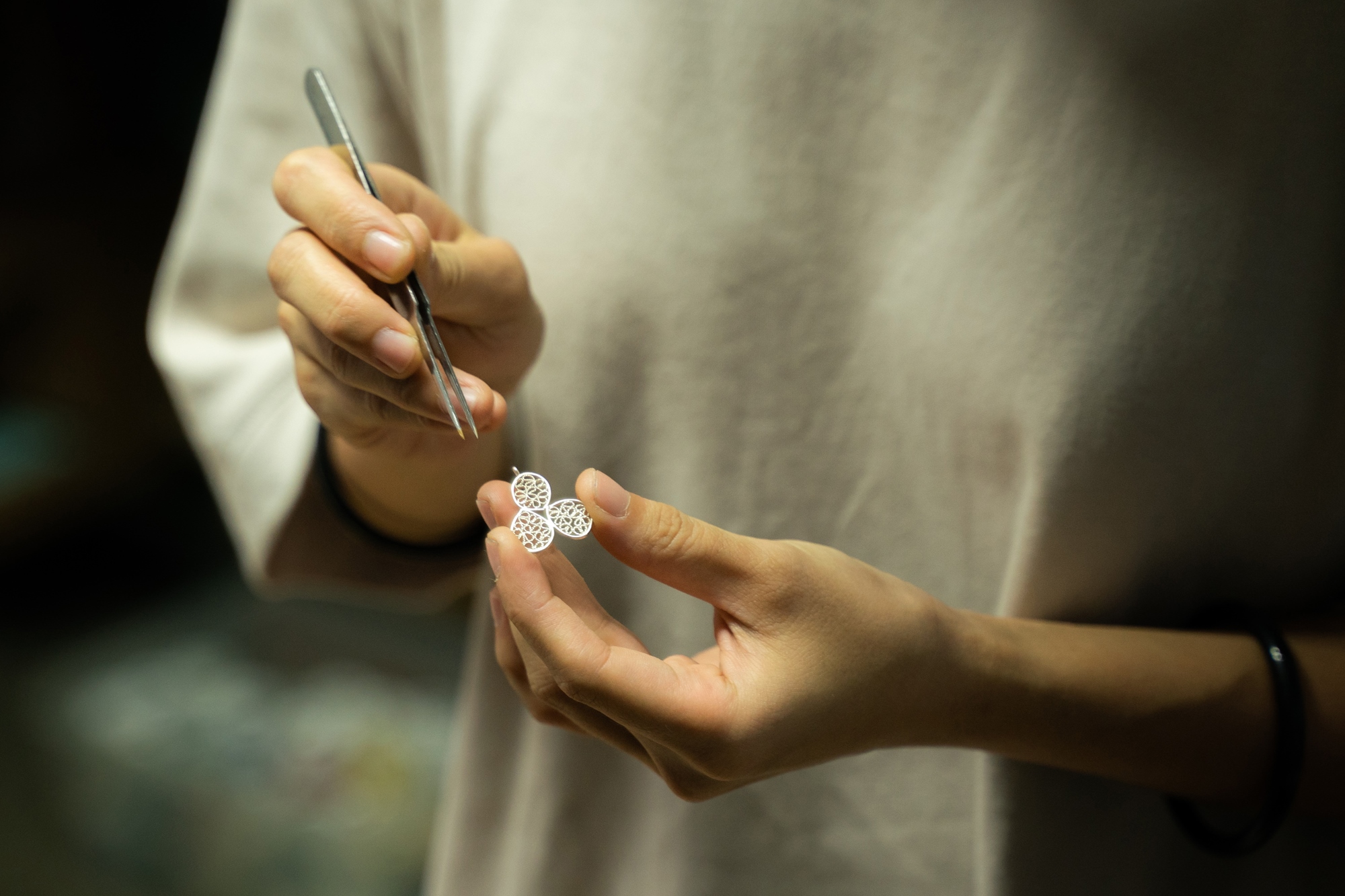 花絲技法為金銀細工傳統技法,當金、銀等貴金屬被拉成細絲後,再用掐、填、攢、焊、編織、堆壘等八大傳統技法造型,將它們製成各種形狀及紋樣。其中,花絲技法與一般銀飾不同的地方在於使用純銀、而非925銀,此技法利用純銀極佳的延展性,備線途中數次燒紅退火,使緊繃的銀線再次回到柔軟的狀態,才能將銀線近一步地抽拉到髮絲般幼細,過程看重金工的基本訓練與金屬手感。