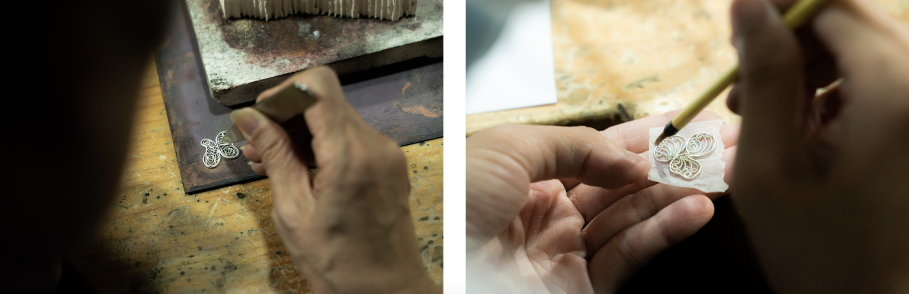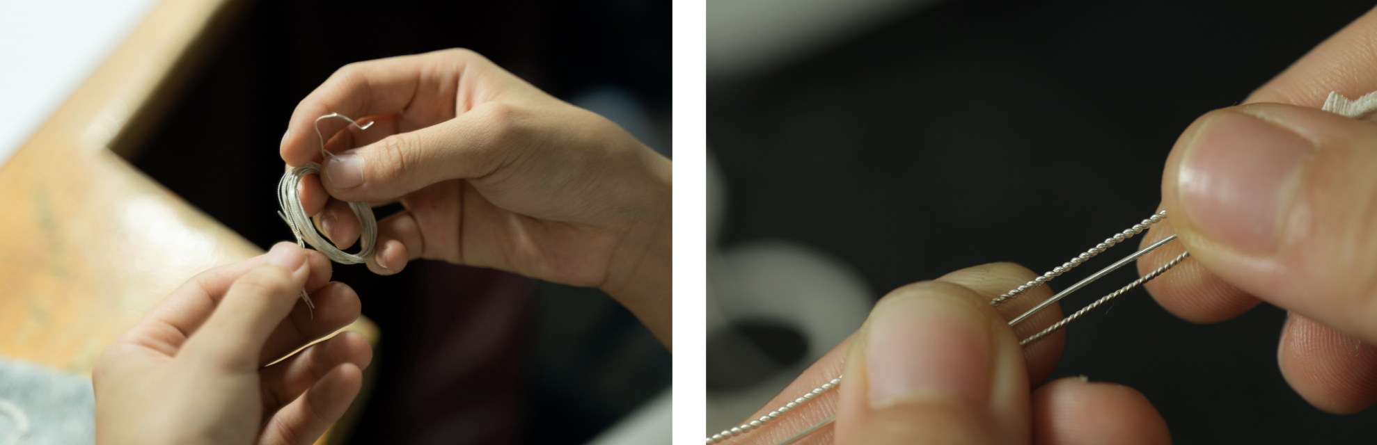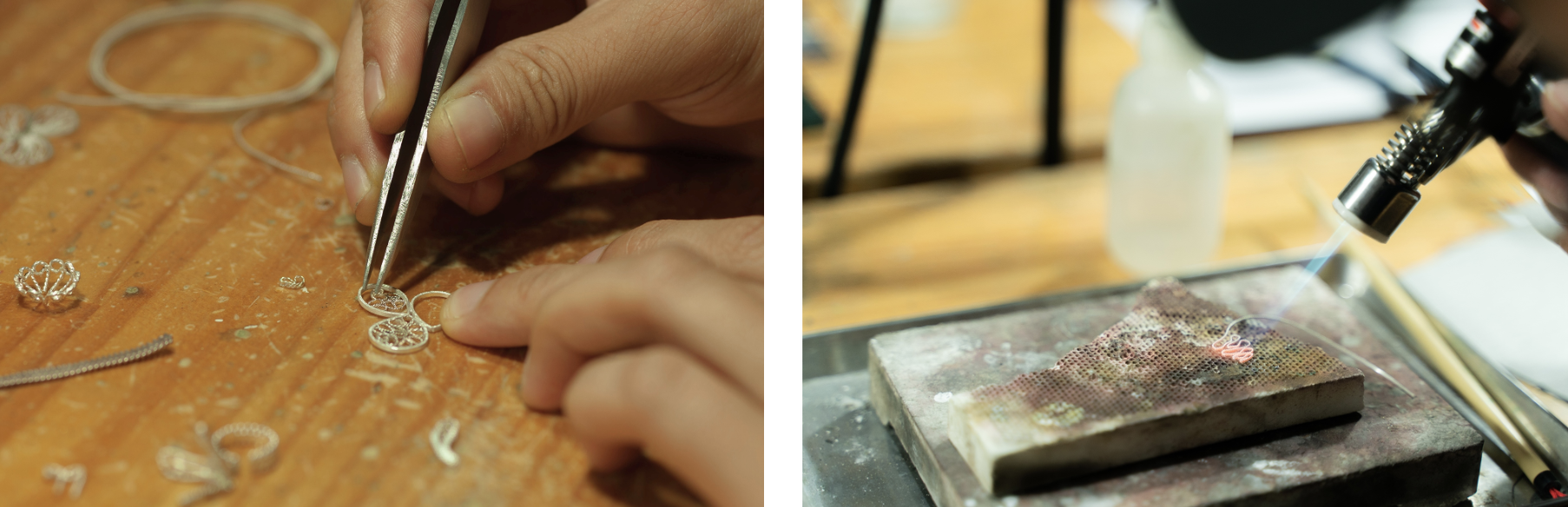 而此次的初階體驗課將會著重於編結單一元件與拼填技法,略過漫長時間的前置備線,從較富趣味的扭絲與輾線開始,體驗線材扭轉帶來的光澤與視覺變化,一步步帶領學員設計圖樣、元件製作,理解花絲如何透過焊接結構來克服純銀柔軟易變形的本質,並依照圖樣設計選擇合適的拼填與焊接方式,一堂四小時的課程最後完成一平面的花絲項鍊吊墜或耳飾。