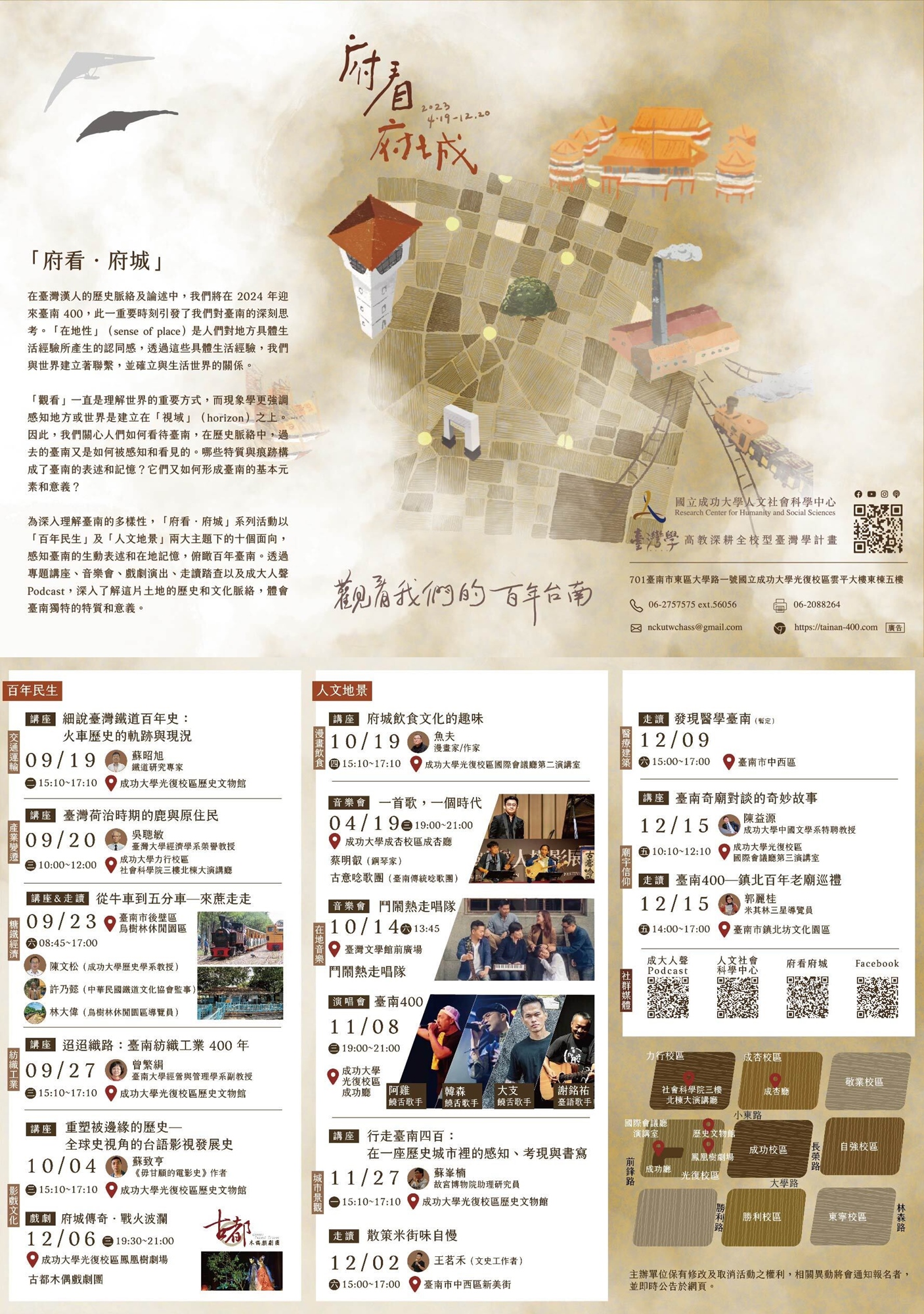 人社中心臺灣學計畫,在迎接 2024 台南400 之際,推出「府看.府城」系列活動,透過音樂會、人文沙龍、戲劇演出、走讀踏查以及 成大人聲 Podcast,從「人文地景」和「百年民生」兩大主題下的 10 個領域面向,深入發掘台南與台灣的在地歷史與記憶,感知台南獨特的文化魅力。
