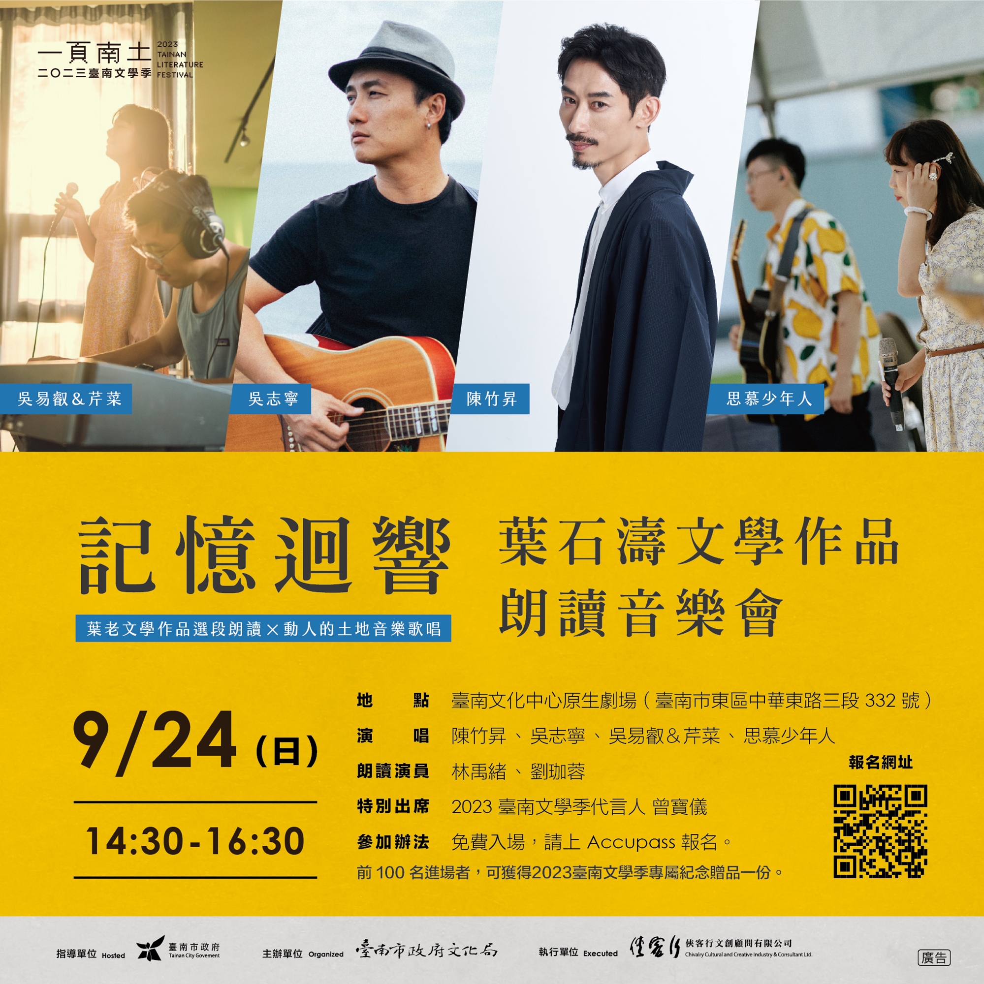 葉石濤出生於臺南,他對於臺南的諸多生活描述,成為現代人認識臺南的起點,少年的葉石濤是古典樂迷,曾學過鋼琴,認為音樂的音感表現就像小說的表現一樣,2023臺南文學季壓軸活動—葉石濤文學作品朗讀音樂會,藉由音樂來傳遞葉老文字的故事。