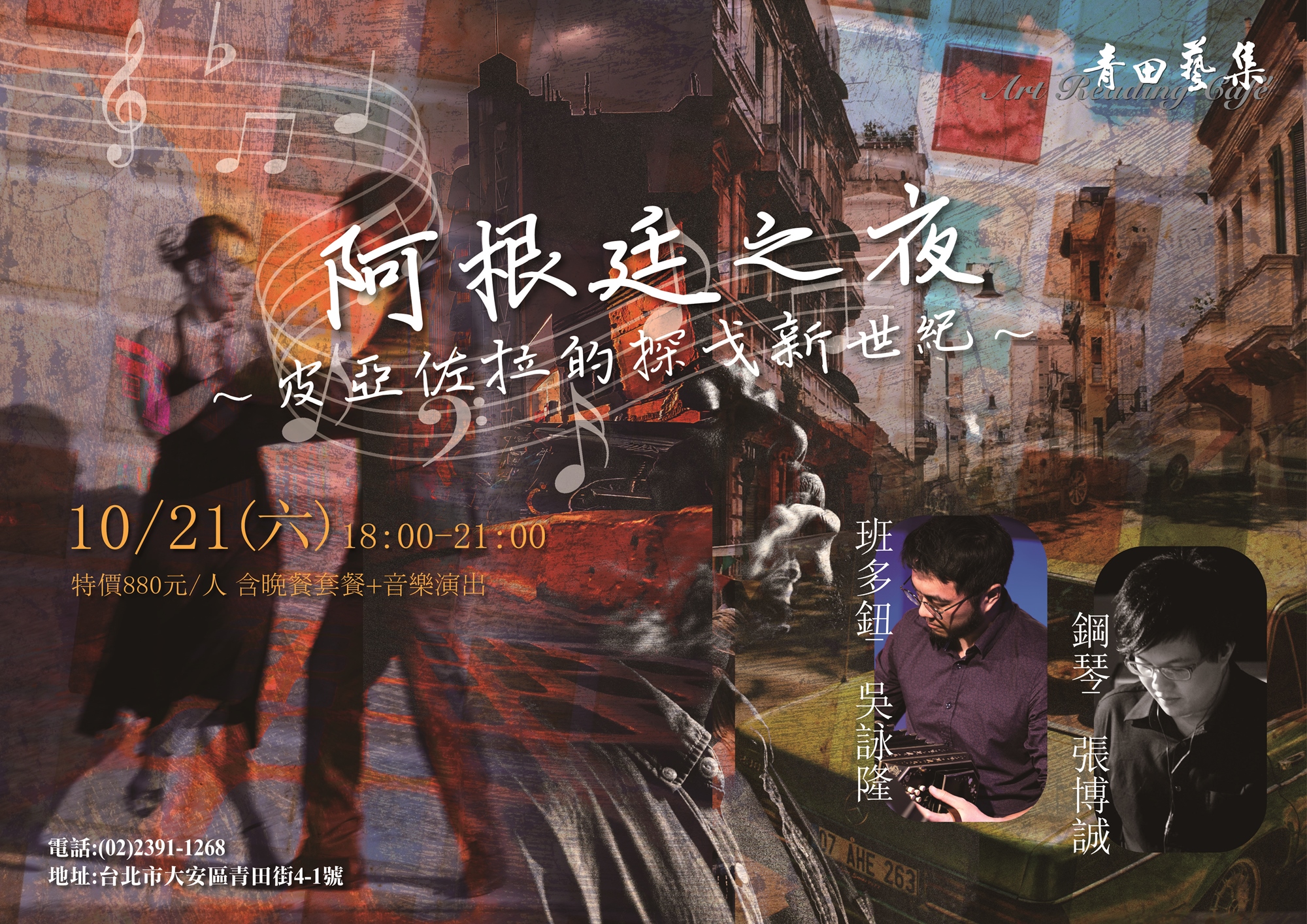 皮亞佐拉是二十世紀其中一位最著名的音樂家,亦是阿根廷探戈及班多鈕琴演奏大師,在他的音樂中可以聽見悲喜交織的情感。在這次節目裡將由國內首位受邀至阿根廷探戈藝術節演出之班多鈕演奏家吳詠隆領軍,連同鋼琴家張博誠共同分享多年來的演奏心得,一起與聽眾分享音樂中那些生命裡的愛與恨、現實與夢想、分離與相聚。