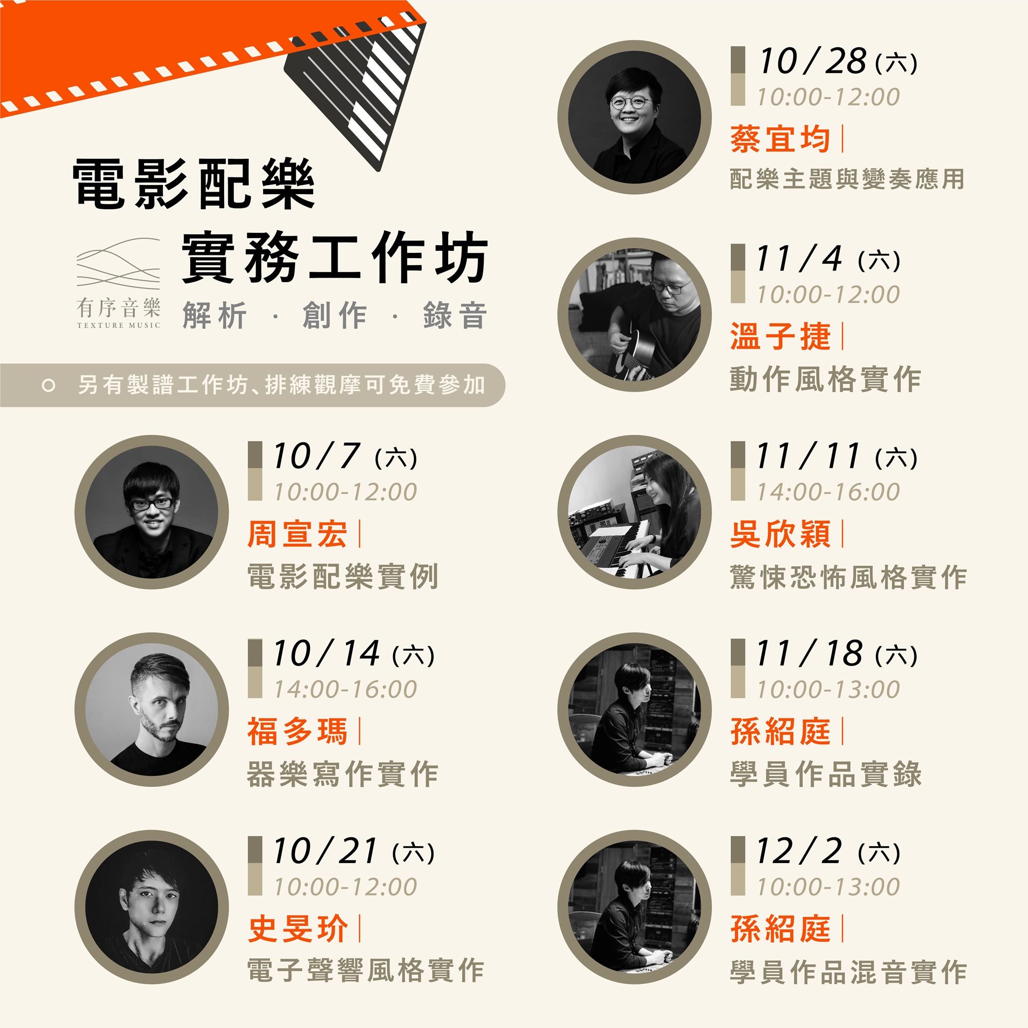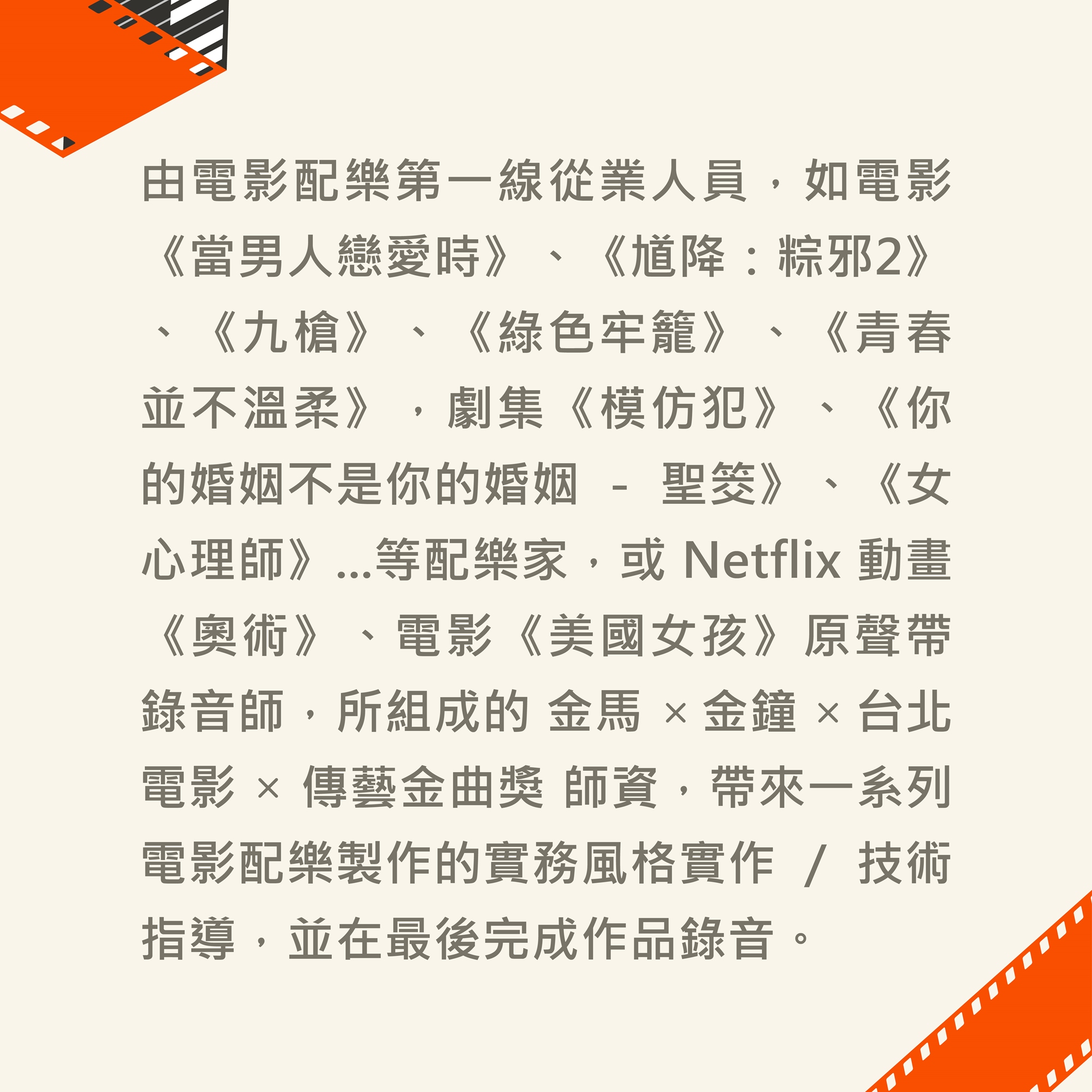 我們期待,在含金量爆表的講師群授課以及作業練習、同儕切磋下,能夠協助你深入探索配樂創作的可能性、啟發自身的配樂創作與製作視野,並透過這門超值的工作坊,帶回屬於你的、能引以為傲的配樂作品履歷!