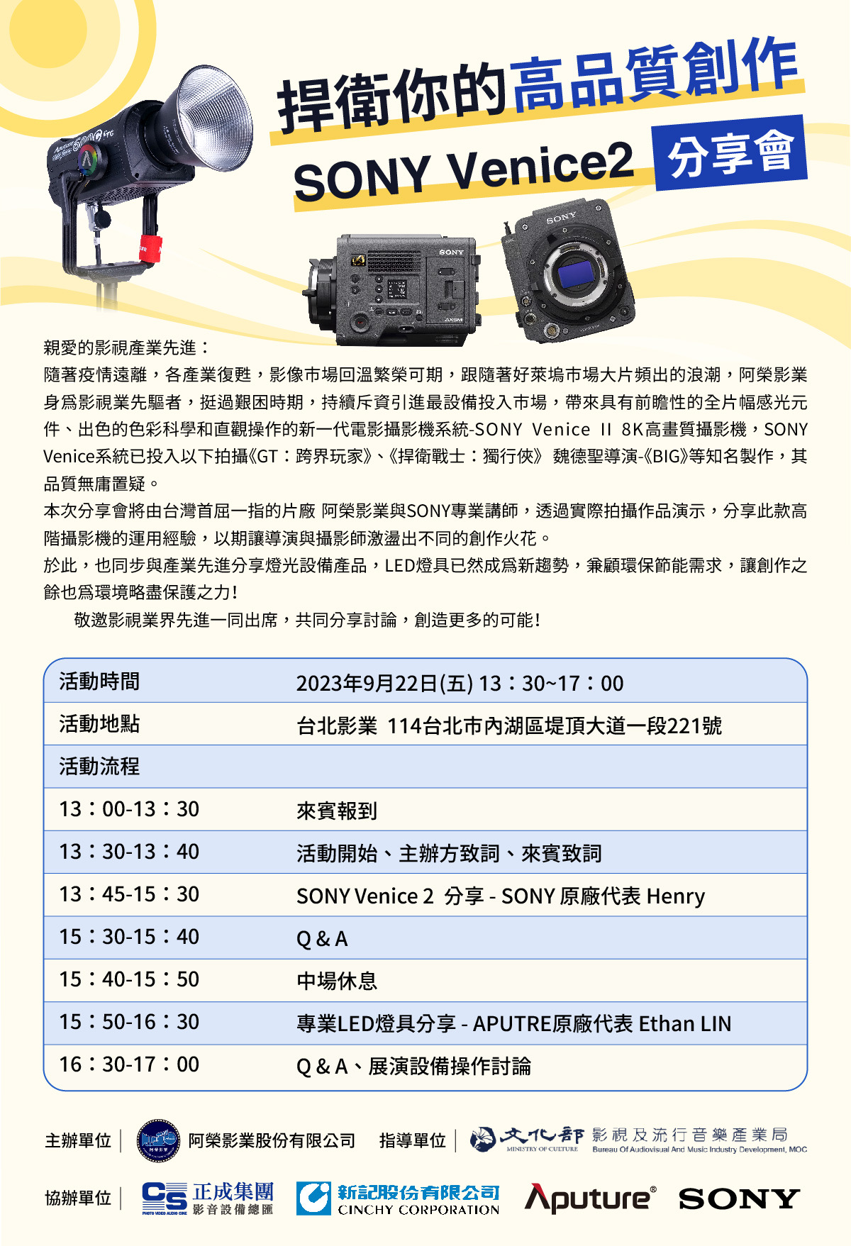 本活動將由阿榮影業帶來新一代電影攝影機系統-SONY Venice II 8K高畫質攝影機的分享,SONY Venice系統已投入以下拍攝《GT:跨界玩家》、《捍衛戰士:獨行俠》、魏德聖導演-《BIG》等知名製作,其品質無庸置疑。本次分享會將由SONY專業講師,透過實際拍攝作品演示,分享此款高階攝影機的運用經驗,以期讓導演與攝影師激盪出不同的創作火花。於此,也同步與產業先進分享燈光設備-APUTURE專業LED燈光,LED燈具已然成為新趨勢,兼顧環保節能需求,讓創作之餘也為環境略盡保護之力!