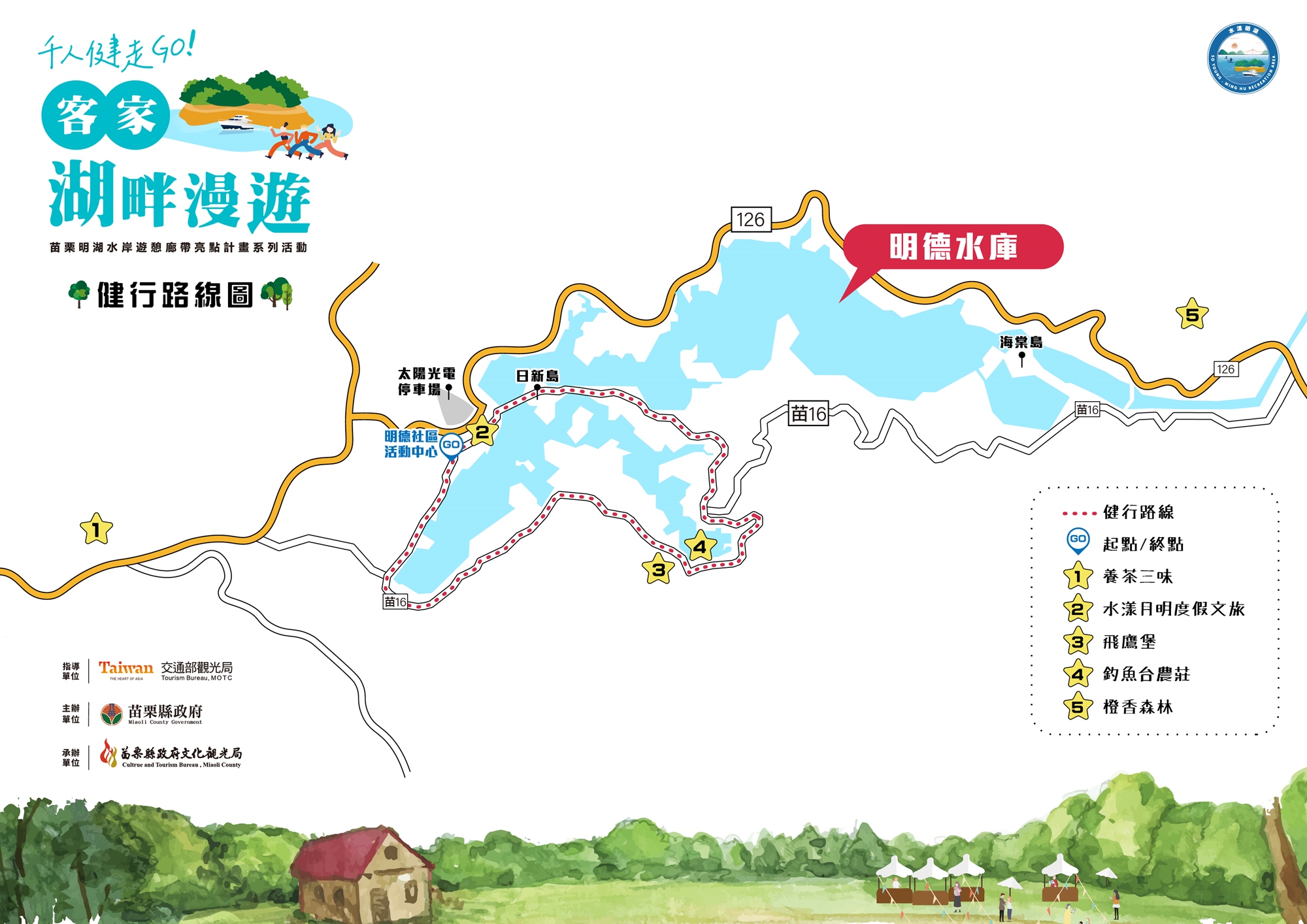 - 健走出發會於10:00鳴笛聲響起後統一出發,前往明德水庫環湖健走,並沿壹號吊橋、貳號吊橋、苗16方向行走,並返回起點。
