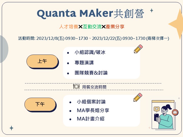 在學時也許還在探索未來的職涯該怎麼選擇,想嘗試各種可能性,但又不知道自己還欠缺什麼能力,或是適合什麼產業,甚至我還有什麼機會可以嘗試?在學時期我又能準備些什麼呢?想了解科技業的生態或是儲備幹部的內容,提早為自己做準備嗎?廣達MAker共創營將提供同學們一個了解科技業與儲備幹部職缺的機會,與其他學校好手共同跳出現有舒適圈框架,一起共創新的可能性,提前為自己加分!