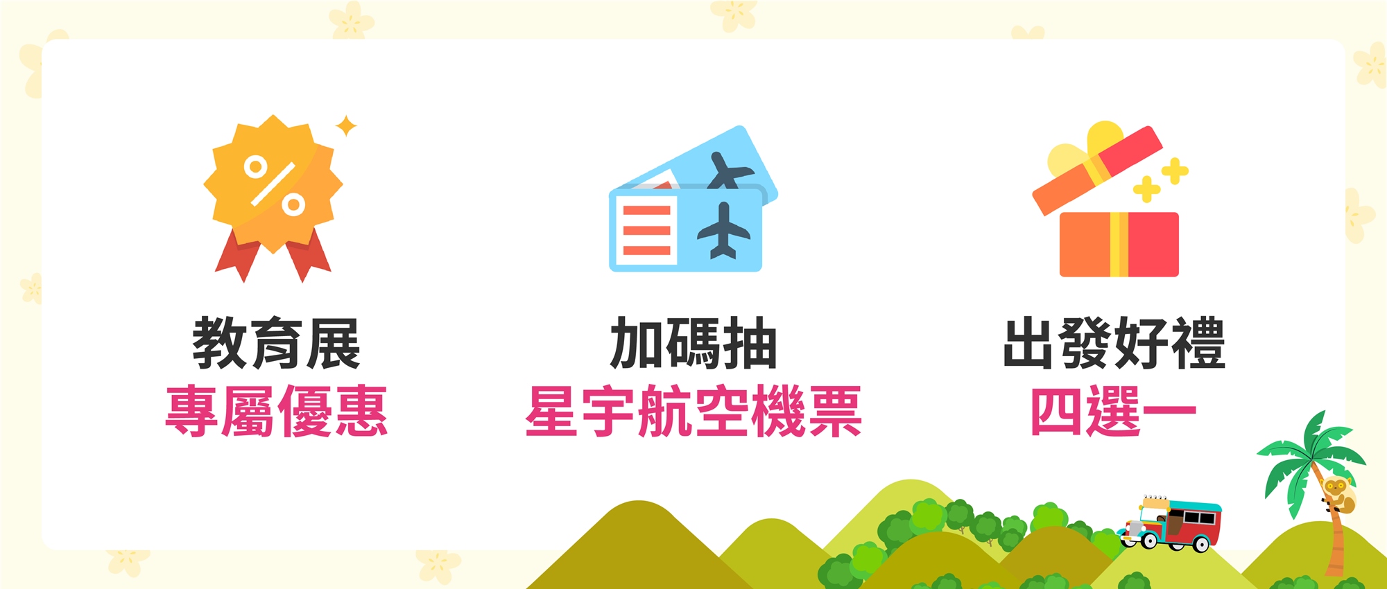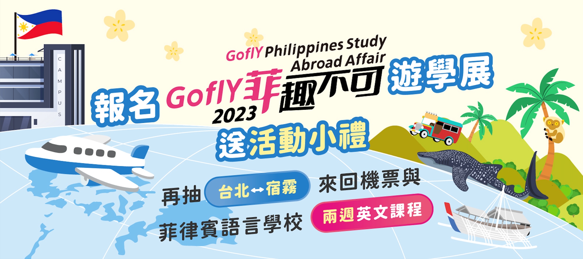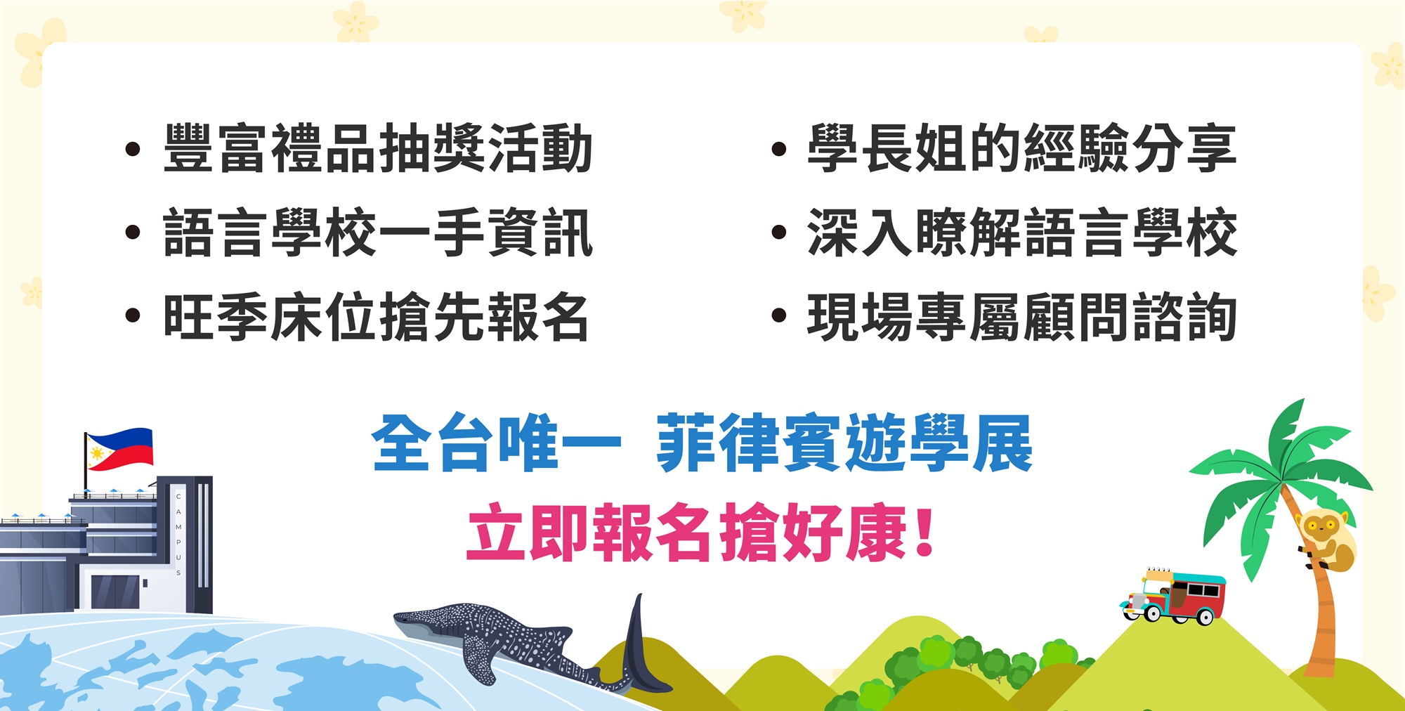 3. 活動現場完成註冊菲律賓遊學課程者享有:教育展語言學校限定優惠、出發菲律賓遊學好禮四選一、加碼抽菲律賓宿霧星宇來回機票