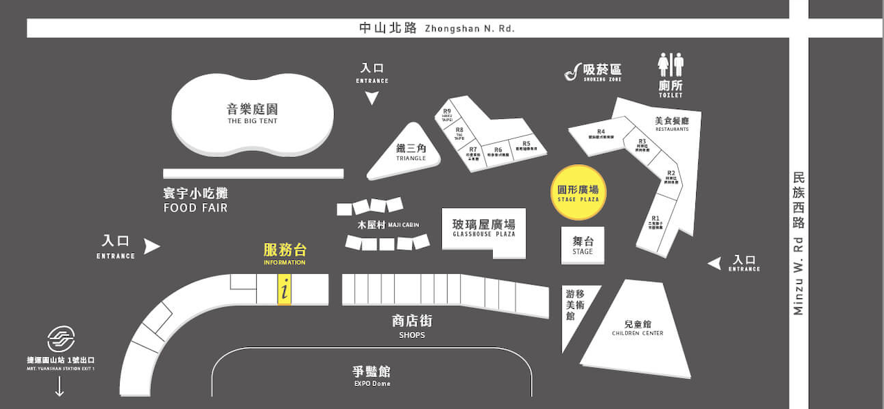 【圓山站】1號出口,往花博爭艷館入口方向步行約5分鐘可達。