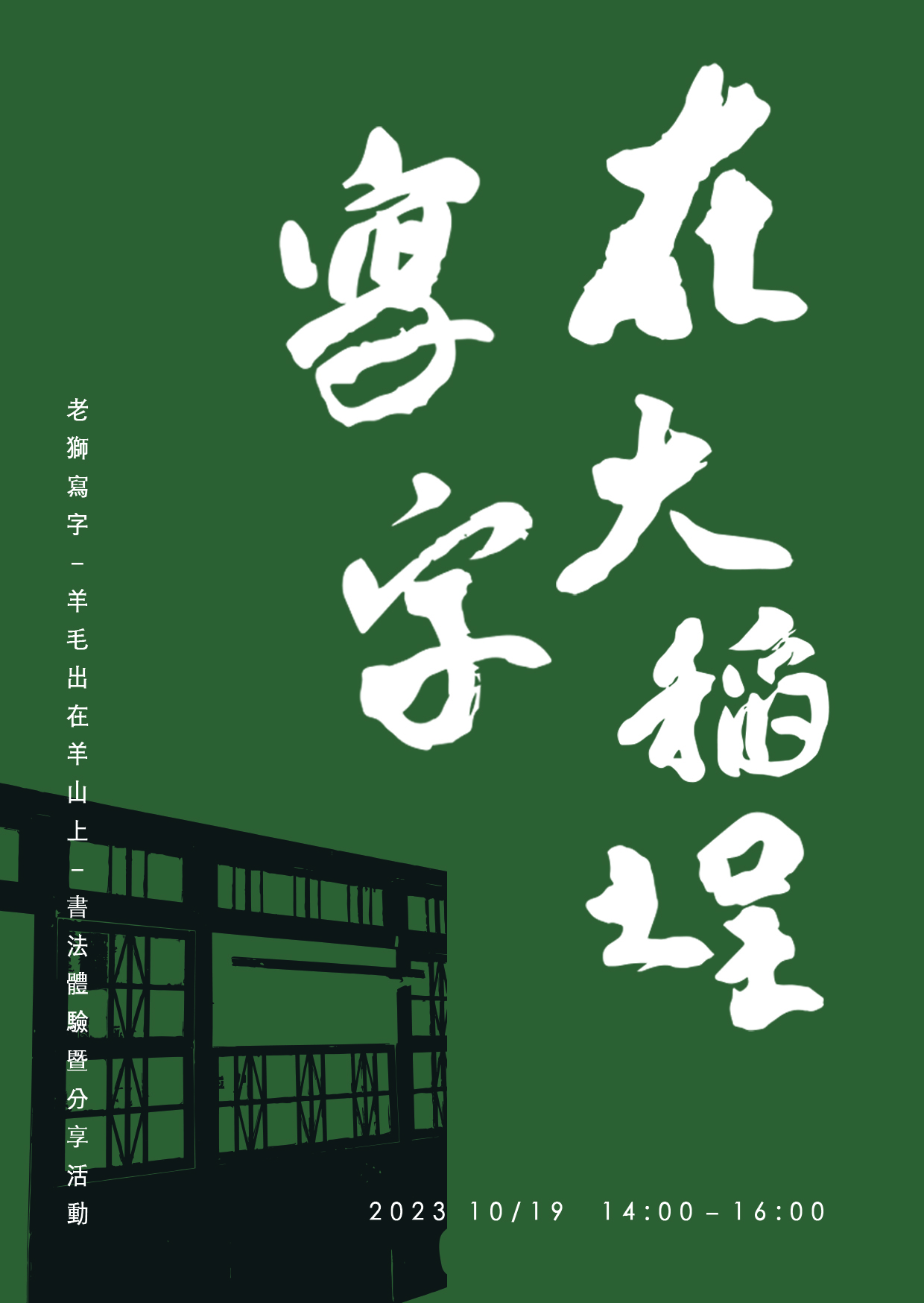 2023/10/19星期四下午,歡迎免費入場參觀。讓我們沈浸在優雅的老建築裡,品味書法的美好。