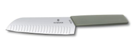 靈感源自日本的 Swiss Modern 三德刀 17 cm長,取名自翻譯「具有三種美德的刀」,且確實體現這點優勢,可輕鬆切肉、水果和蔬菜。為減低摩擦並避免食物黏附,特別採用 17 cm坑槽刀刃。流線型手柄為廚具增添亮點,而且符合人體工學,堅固耐用。