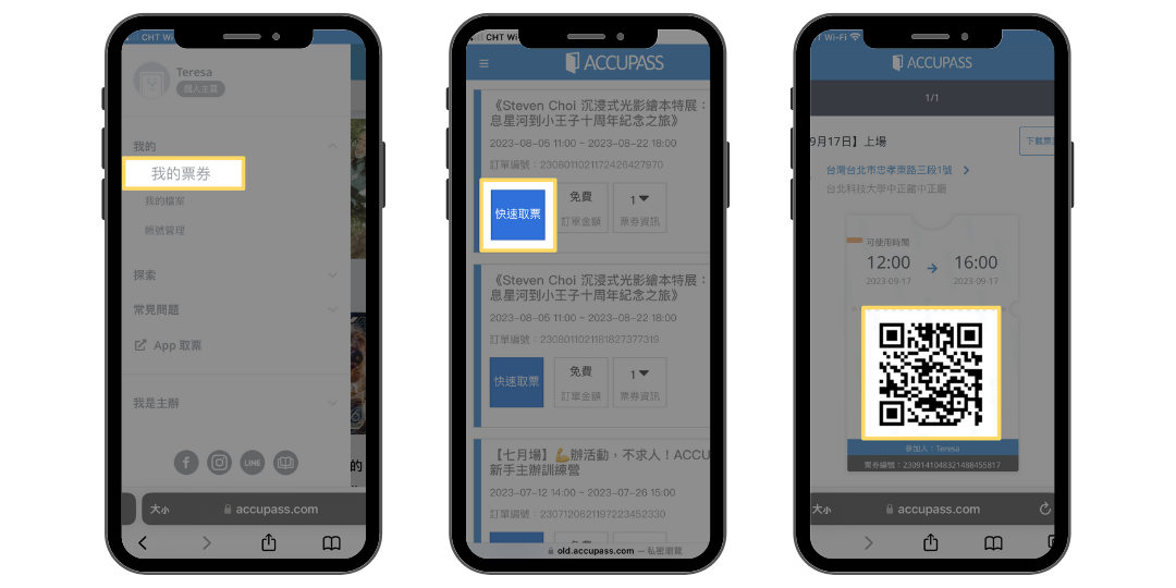 - 步驟2-進入「我的票券」頁面,點選「快速取票」,便能查看可供驗票入場之票券QR-Code。