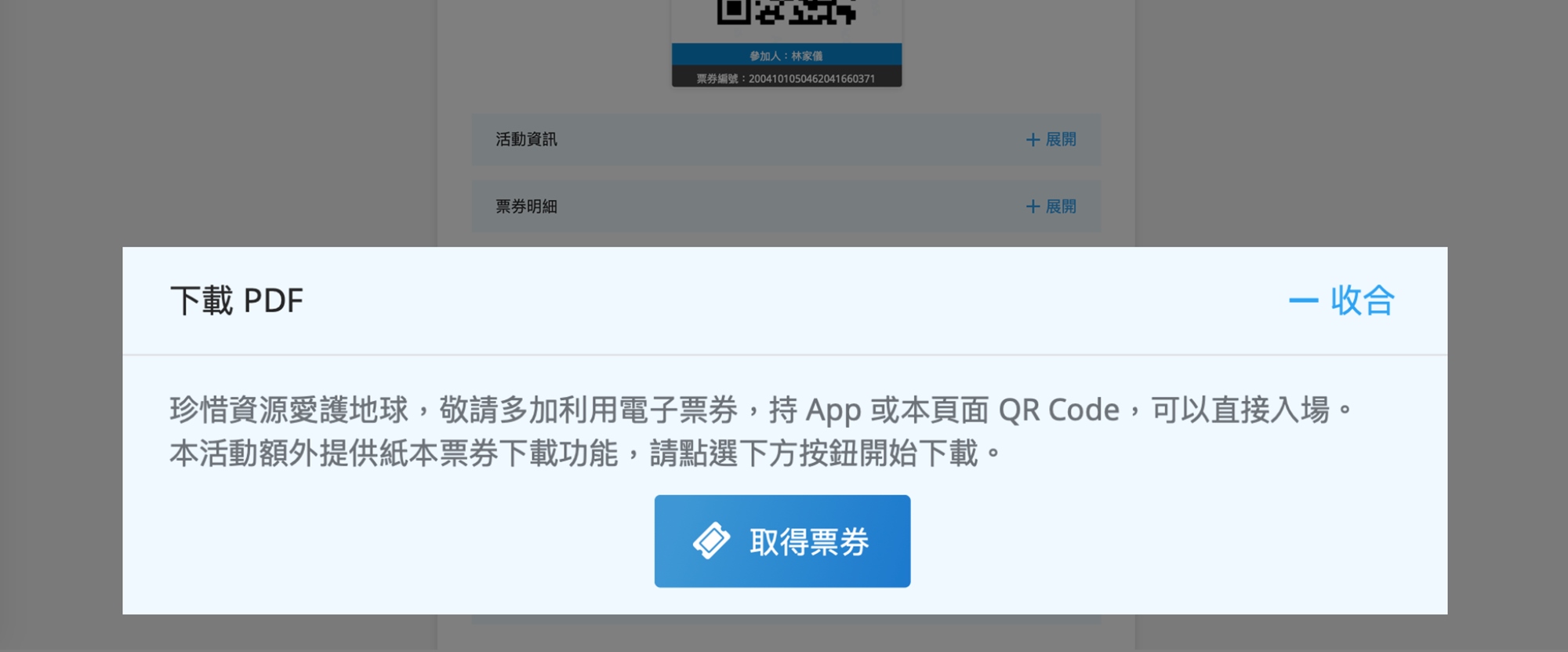 步驟3-滑至頁面最下方,點選「下載PDF」,再點選「取得票券」,即可獲得票券PDF檔案。