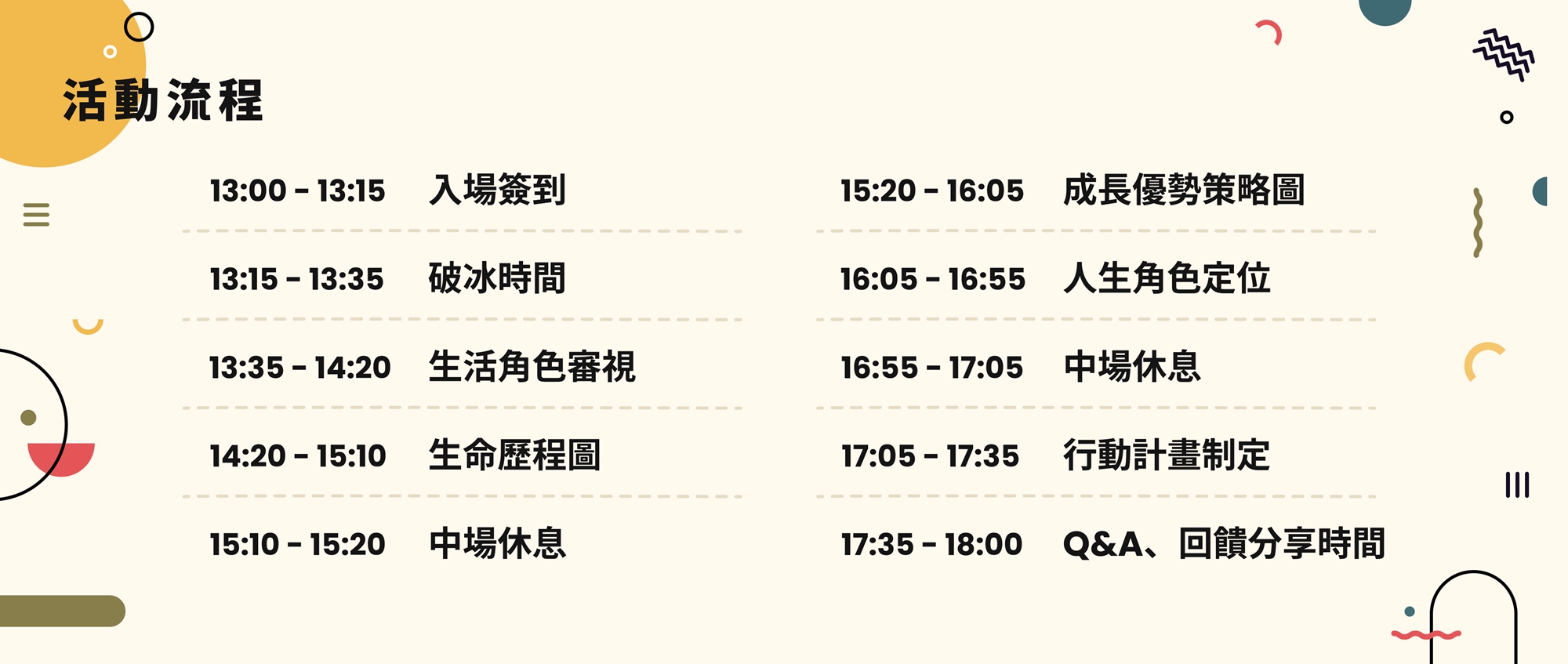 - 本工作坊非一對一諮詢,過程中各環節教練會下場引導並透過小組討論形式,相互交流,探索自己