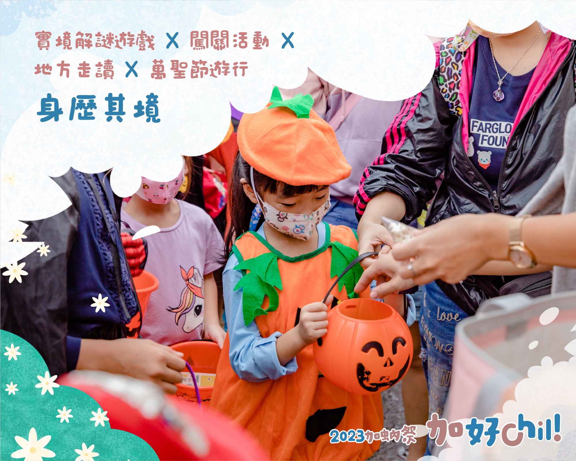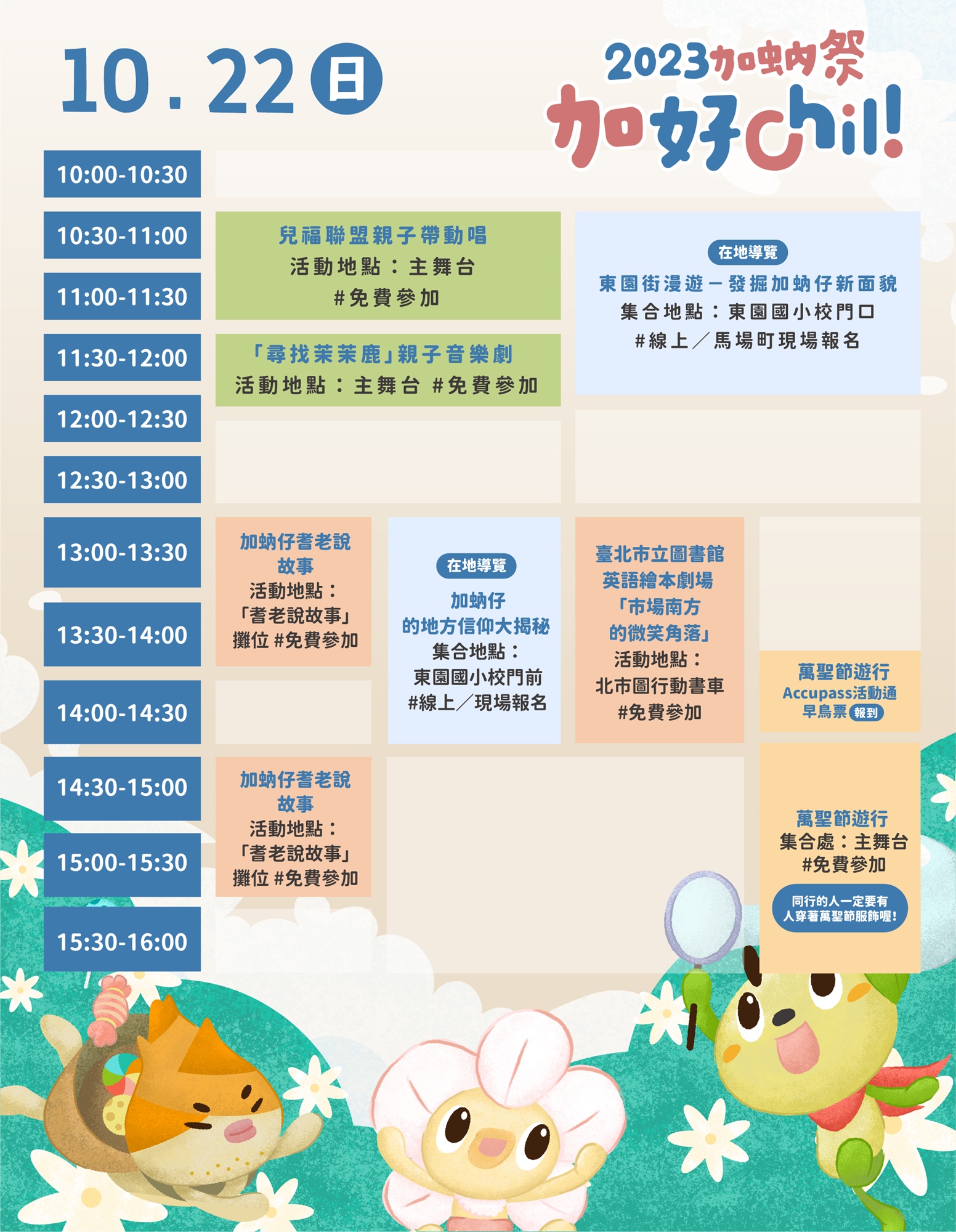 10月下旬適逢萬聖節,加蚋祭邀請大、小朋友盛裝打扮,14:30於馬場町紀念公園出發,沿著青年公園繞行,沿途向周邊店家「不給糖、就搗蛋」!報到時間:𝟭𝟬/𝟮𝟮 ㊐ 𝟭𝟰:𝟬𝟬-𝟭𝟰:𝟯𝟬 |集合地點:主辦單位前