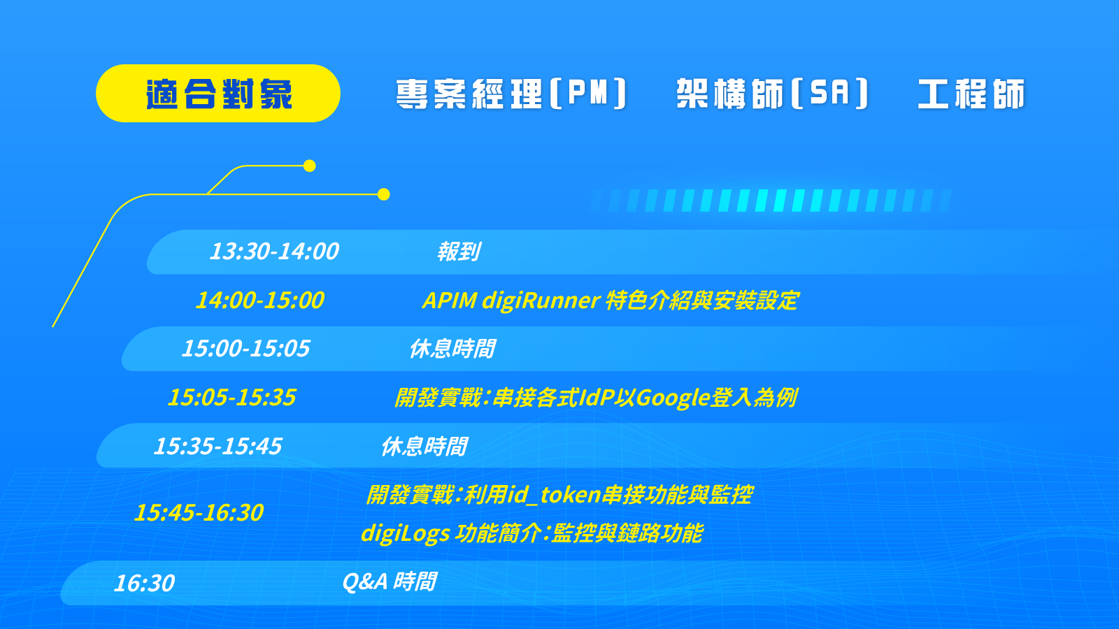 講師會帶大家透過實際操作 digiRunner API管理平台,學習如何將常見的基礎功能轉嫁由APIM為您工作,省下大量開發成本,最後也會展示 digiLogs 獨家開發的視覺化地圖,進行微服務節點監控,資料怎麼串接、流動、哪裡有問題一目了然,前、後端工程師再也不用花時間找出問題點了,最後您是否也想了解digi系列產品雲原生微服務的奧妙呢?那就請您與講師互動一起找出答案吧。