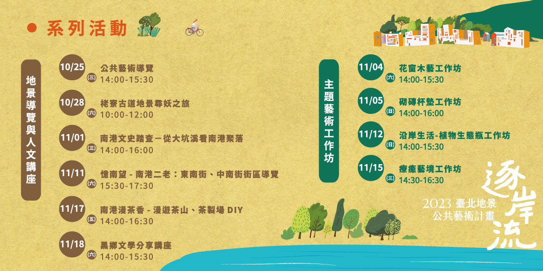 活動邀請奇幻推理小說家「瀟湘神」,結合「南港栳寮古道踏訪」及「魔神仔主題演講」,揉合在地的歷史、民俗與文化進行戶外踏查,帶領學員以藝文/異聞的角度探訪南港地景。南港「栳寮古道」又名「腦寮古道」,為昔日生產、運送樟腦山徑,不僅茶行林立,也是茶商與村民時常行經的道路,現今為尋幽踏青的登山路徑。