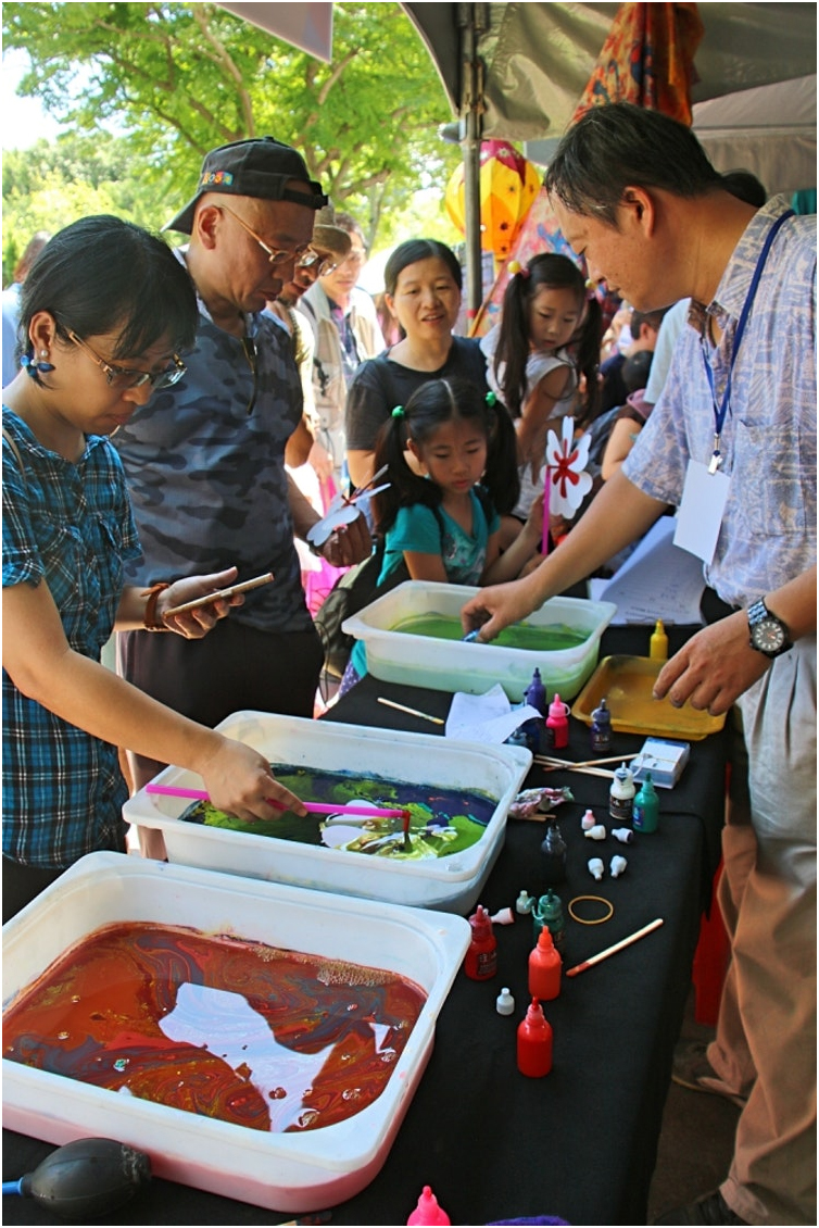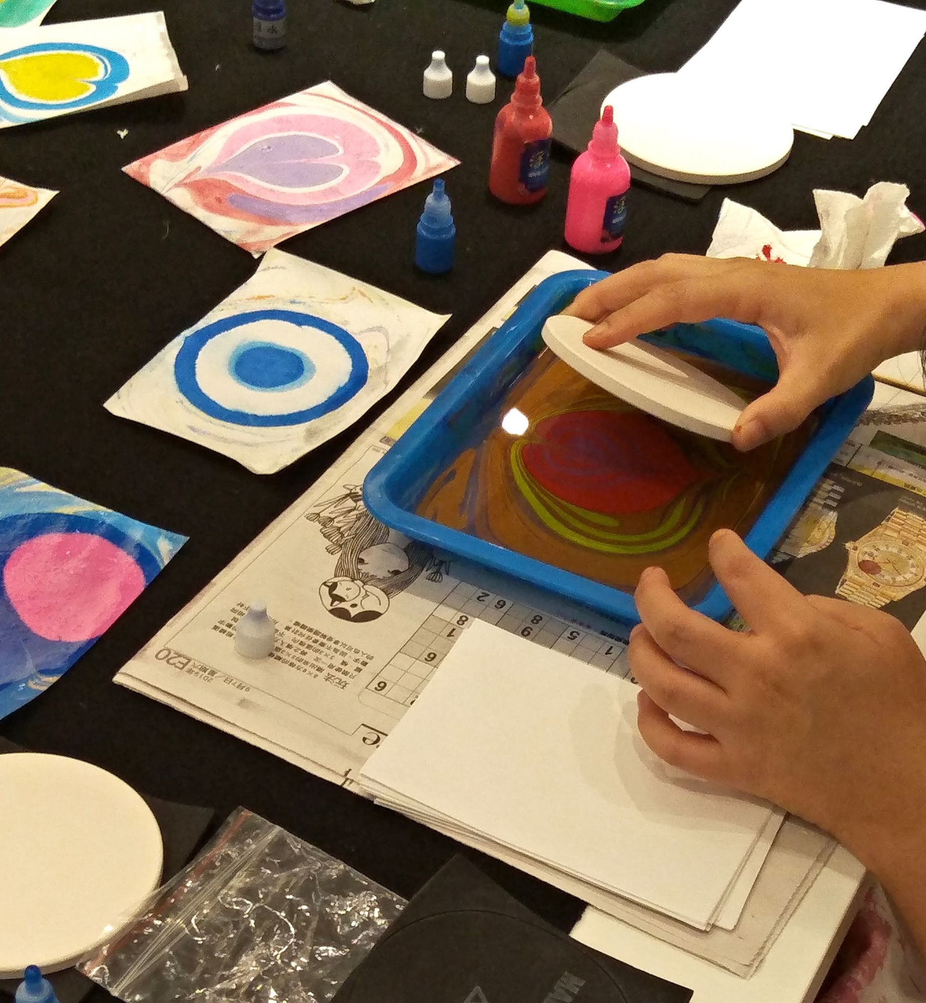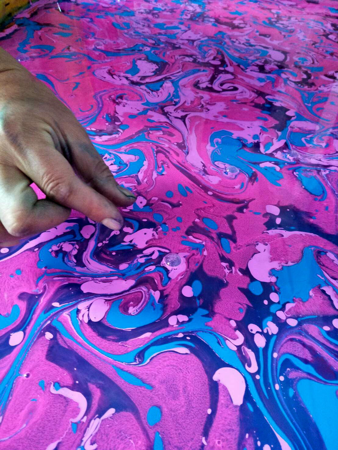 A.浮水染(marbling)的中文意義就是創作大理石紋理的方法,主要是將浮在水面上的彩色油彩,選用具有吸水性的材質把色彩吸附到表面的技法,成為令人驚豔的藝術創作,而其中的抽象圖紋就像大理石上的精美裂紋一樣天然生動。