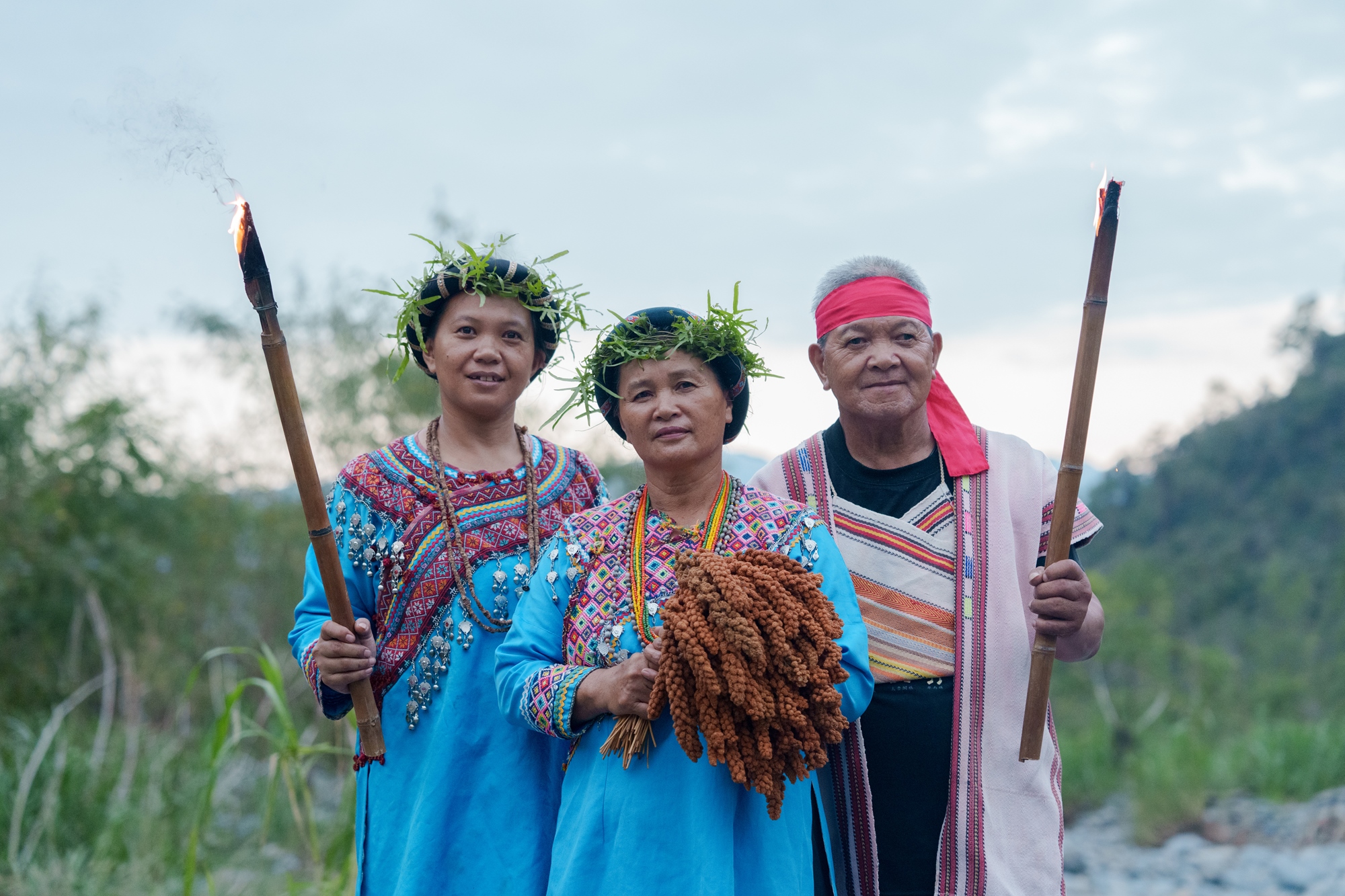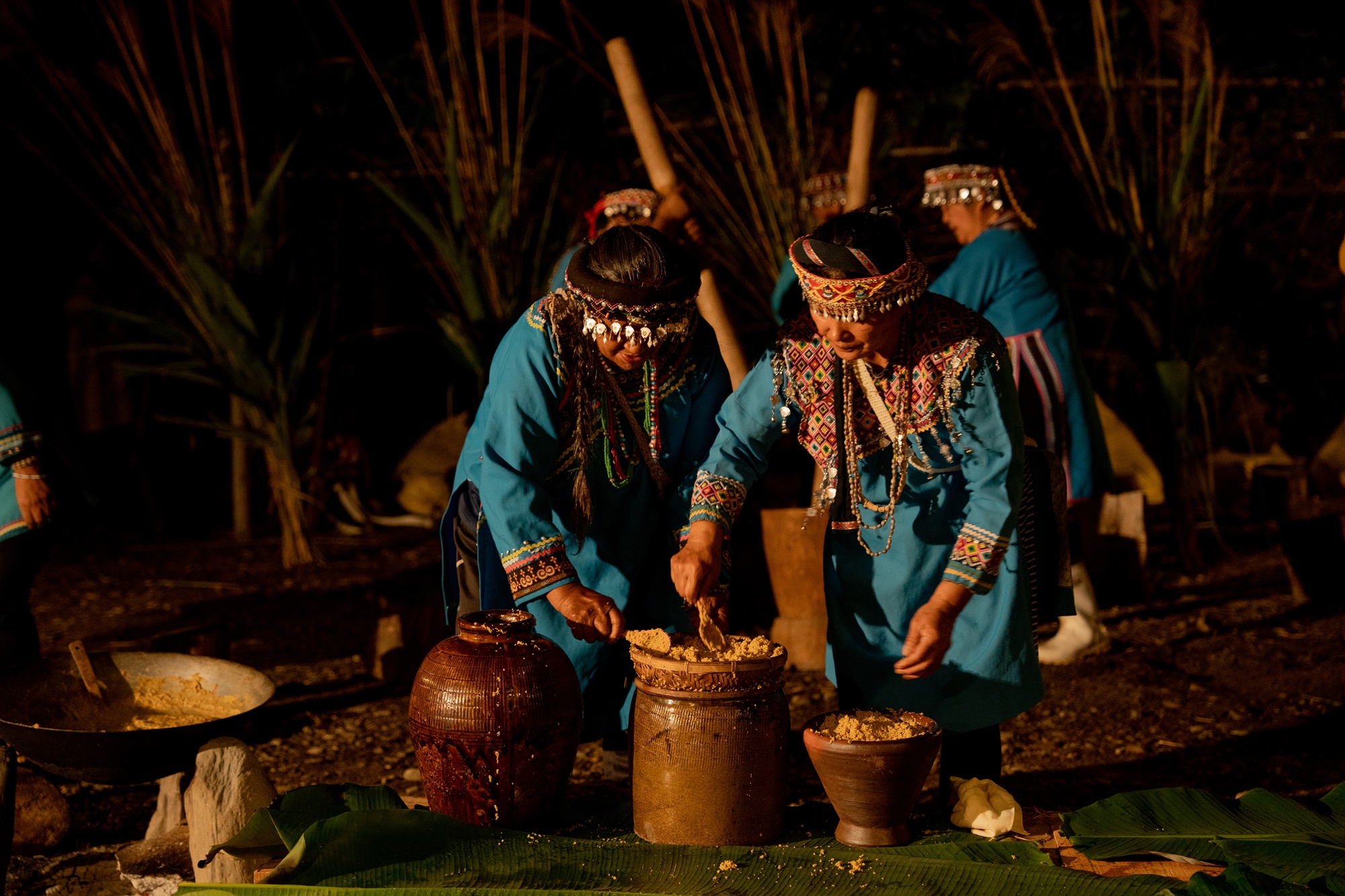 夜色下、火光旁,伴隨著歌謠聲聲吟唱,微劇場悄悄開演。咚!咚!婦女搗篩小米的低沉聲響,彷彿撞進人們心底,每一下都是對於自然母親的感謝,每一次都在靜靜等待獵人歸來。倏忽,報信歌在耳邊響起,獵人帶著獵物凱旋歸來,和族人共享豐收的美好。皎潔月光灑落,映照出一張張專注神情,以及部落的日日如常。