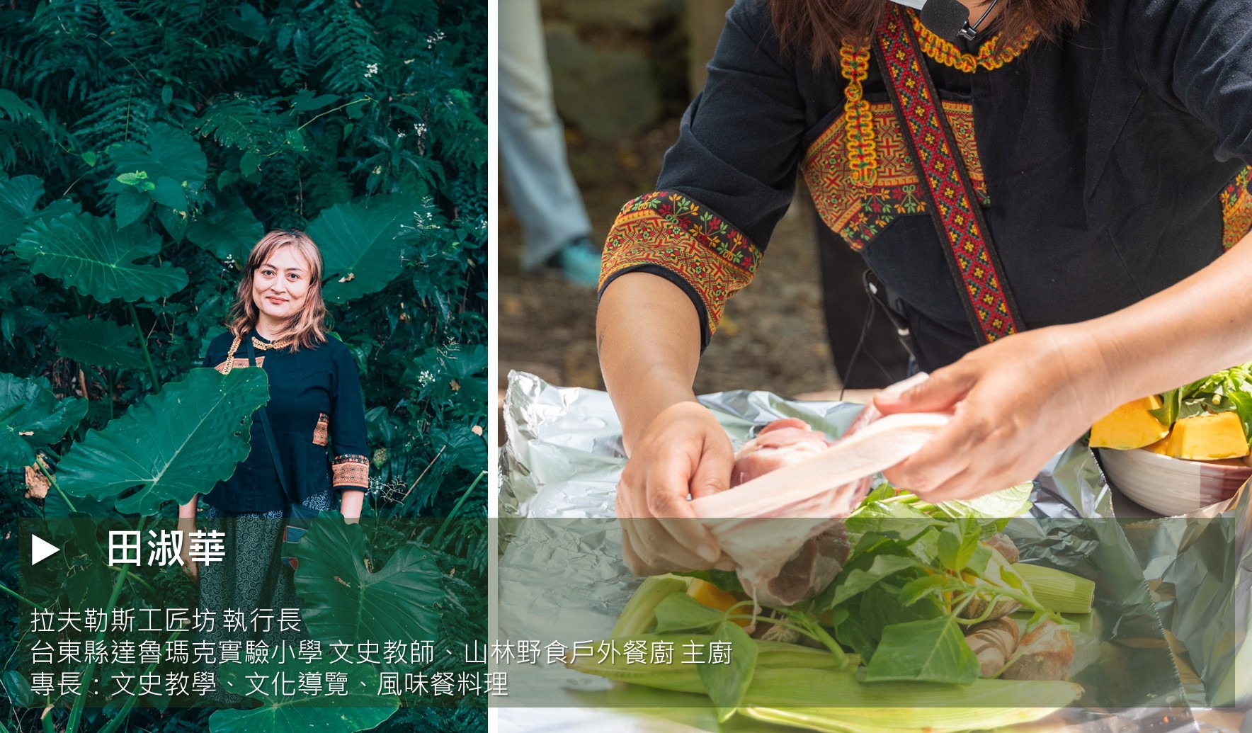 來自臺東達魯瑪克部落的淑華姐,是一位文史教師。淑華姐運用上午大家剛採集到最新鮮的野菜,親自煮炊成一道道料理美食,達魯瑪克原民風味的特色料理,沒有過多的調味與加工,每一口盡是森林令人感動的純粹原味,讓人身心靈大滿足!