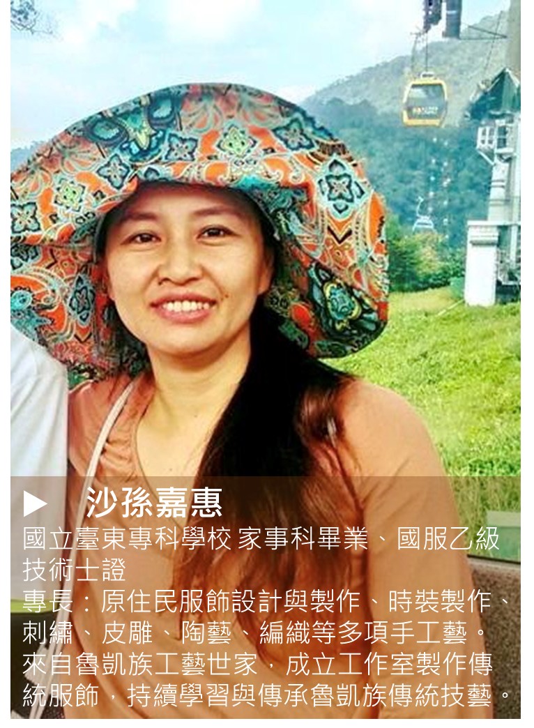 沙孫嘉惠是來自魯凱族的工藝世家,從小熟悉原住民的服飾設計與製作。魯凱族傳統服飾上美麗的圖騰,是魯凱婦女一針一線為家族貢獻的心力與巧思,更是現代重要的技藝文化傳承,這堂課我們來認識這個傳統技藝「十字繡」。