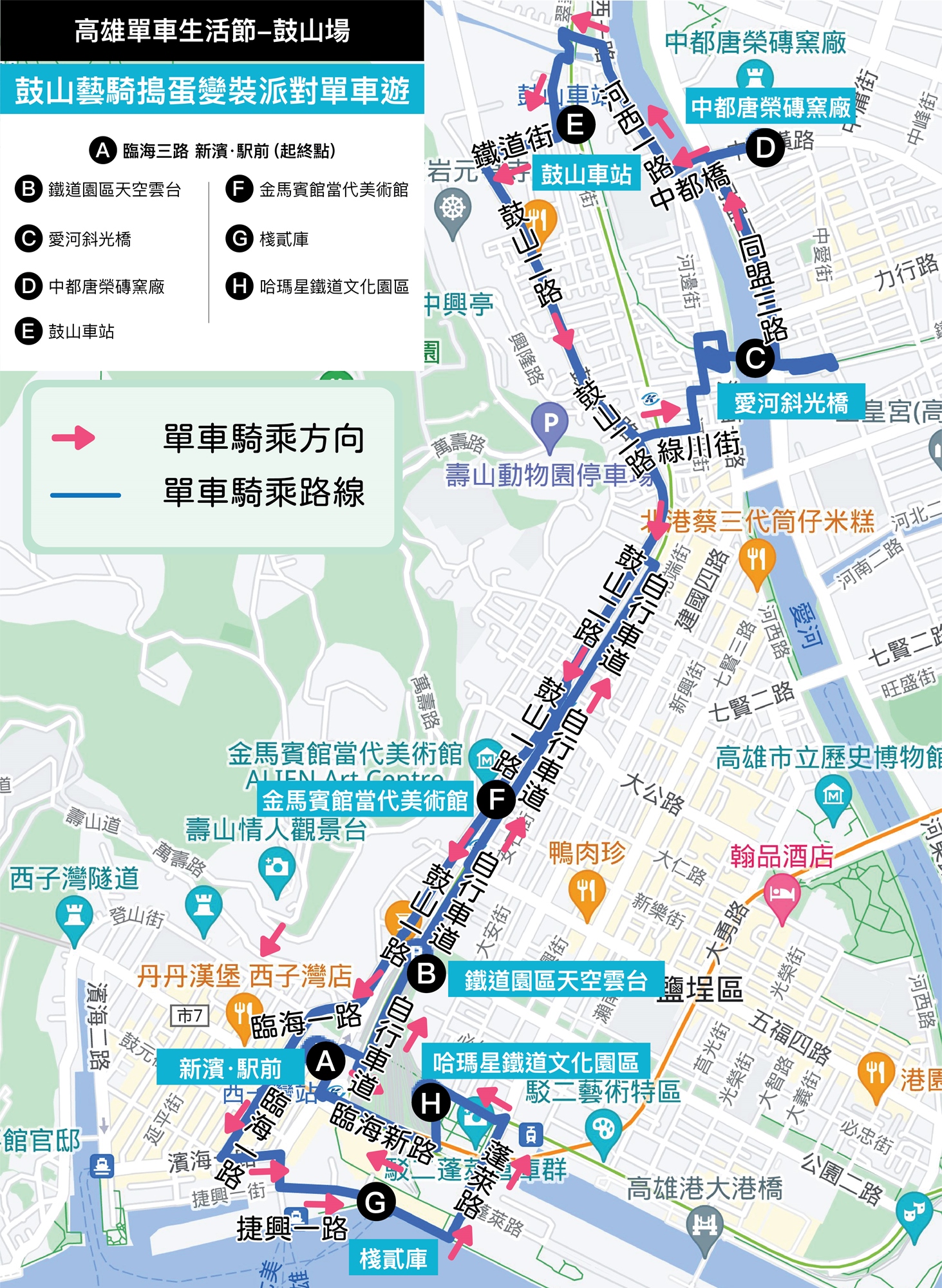 新濱•駅前▶▶鐵道園區天空雲台▶▶愛河斜光橋▶▶中都唐榮磚窯廠▶▶鼓山車站▶▶金馬賓館當代美術館▶▶棧貳庫▶▶哈瑪星鐵道文化園區▶▶新濱·駅前&【乘風而騎單車市集】