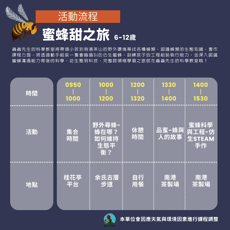 2. 戶外活動會由老師依據現場狀況更動路線或行程,如臨時有更動敬請見諒。