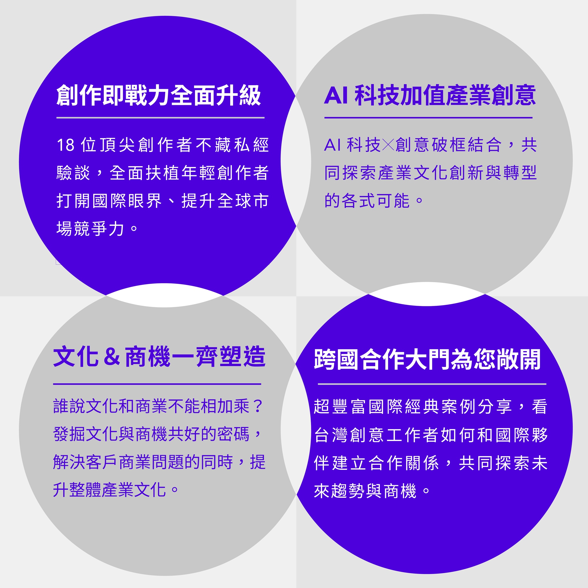 通過舉辦各種包括講座、教育活動、工作坊和培訓課程以及創新比賽等活動和企劃,結合文化藝術與商業合作, 我們希望能夠激發成員們的創造力和創新性,並推動社會與文化的前行,與不同領域的交流和創新。