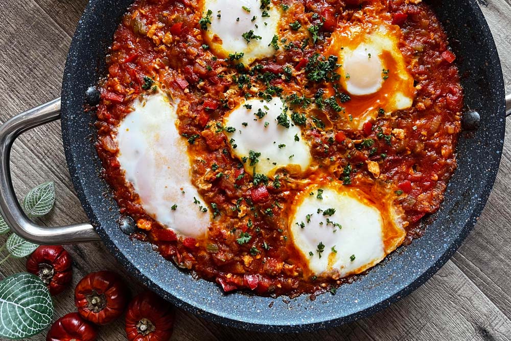 一鍋到底、好看又好吃的佛朗明哥蛋,在北非又稱為夏修卡。將蔬菜切丁、拌炒、燉煮,最後挖洞加入金黃色的雞蛋,每樣食材與鍋面親密接觸後的梅納反應帶來濃郁的香氣,食材起鍋後,少量殘留於鍋中的精華疊加,風味十足、層次豐富,搭配基本款法棍、軟法等麵包,早餐豐盛程度瞬間Levl up!