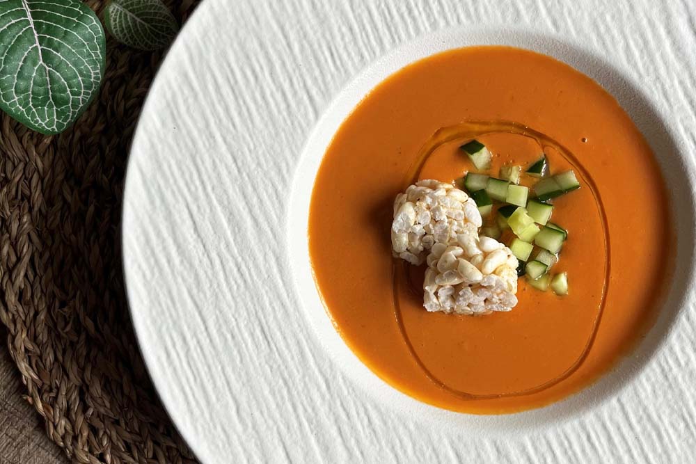 源自西班牙南部的安達盧西亞地區,地中海型氣候致夏季相當炎熱,作為前菜湯品,為了讓胃準備好迎接後面的重頭戲主菜,溫度剛剛好,而且還能開胃消暑的冷湯成為當地經典。
