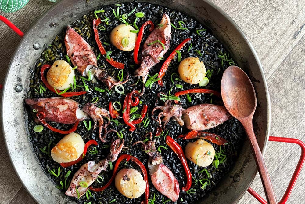 紅醬、白醬、青醬比較常見,這次教大家墨魚醬。取生食級干貝、小卷香煎,再倒入西班牙米或義大利米,與墨魚醬拌炒,外酥內軟的配料,米粒吸附飽滿鮮甜海味,一口下肚,還以為置身地中海岸。