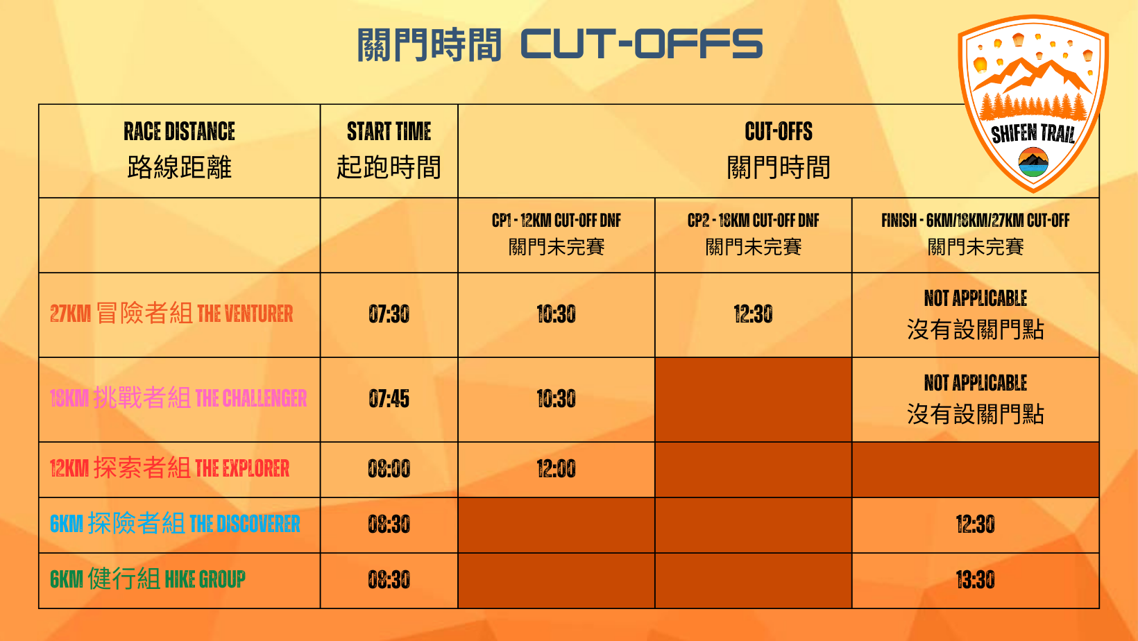 - 07:15 賽事宣講(27km / 18km / 12km) Race Briefing (27km / 18km / 12km)
