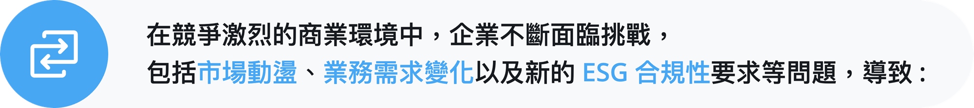 - ESG 合規性:需要迅速收集、整理和報告相關數據以符合合規要求,但這要大量人力和時間
