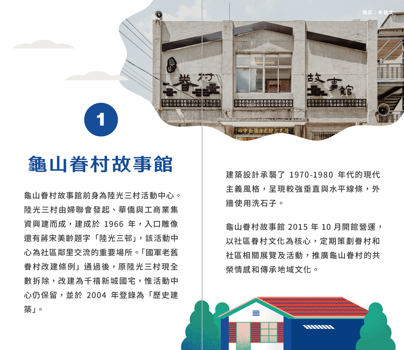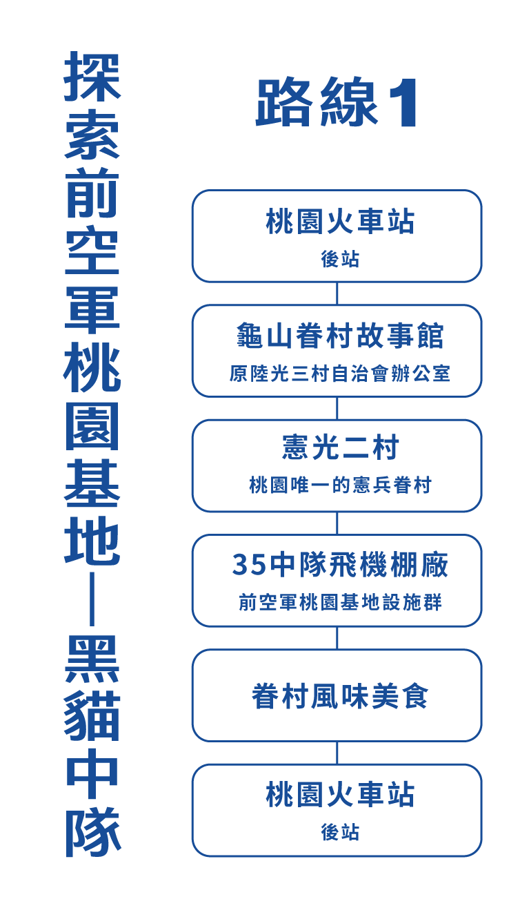 路程順序從桃園火車站集合出發,由專人導覽龜山 眷村故事館(早期為龜山區陸光三村自治會辦公室) 憲光二村(桃園唯一的憲兵眷村)、35中隊飛機棚廠(前空軍桃園基地 設施群),大家共同在基地品嚐眷村美食餐盒,最後回到桃園火車站。