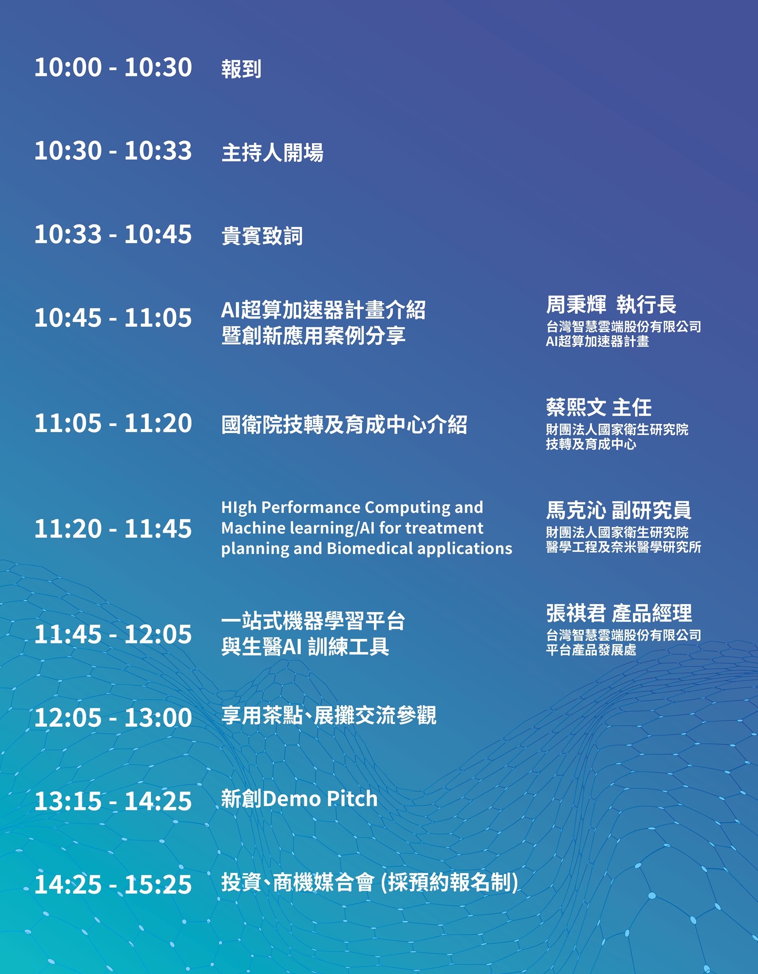 為推動AI應用與生醫產業的融合與交流,透過台智雲AI超算加速器和國衛院創新育成中心之培育新創廠商的成果展示,為AI應用及生醫產業鏈結跨域商機與合作機會。