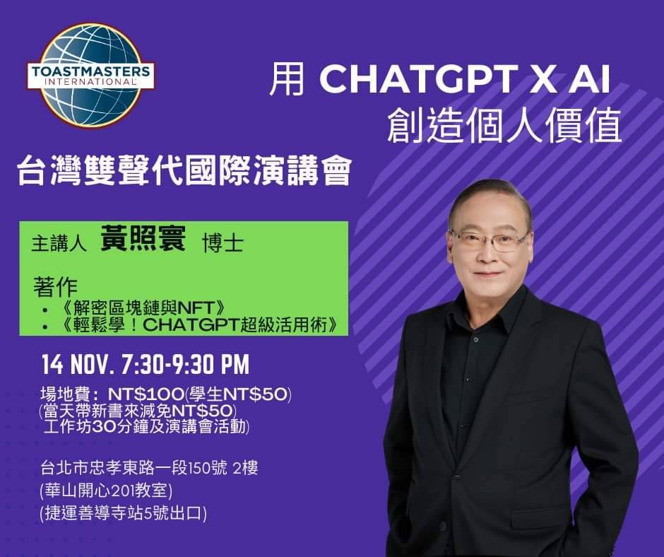 11月14日晚上七點半,邀請您來台灣雙聲代國際演講會,讓黃照寰博士透過他專業的科技背景讓我們結合ChatGPT在個人生涯更上一層樓。