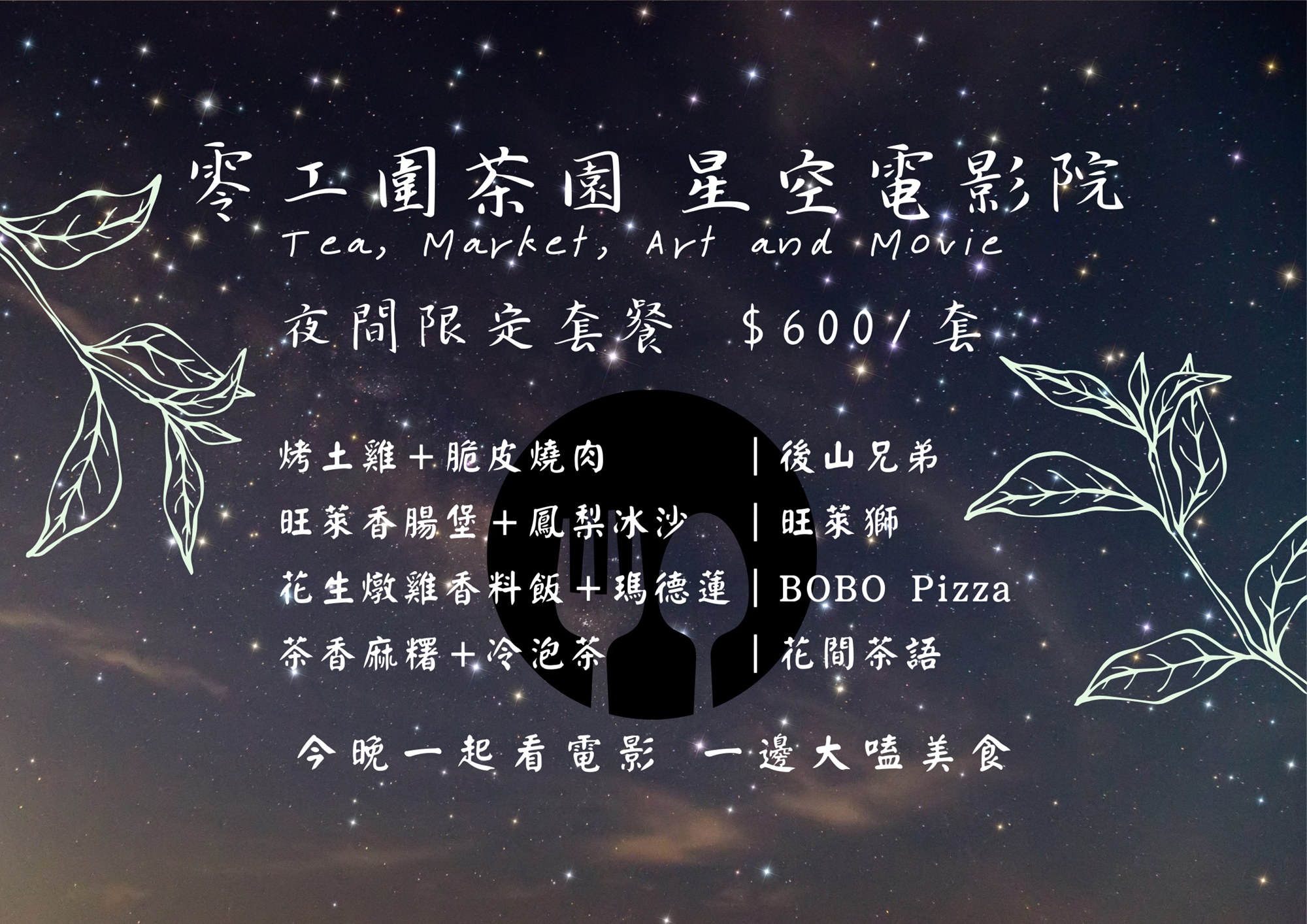 入夜後將茶園周邊路燈關閉,在寧靜山邊欣賞戶外電影,搭配由瘋腹市集提供夜間限定套餐,一同在茶園的傍晚,聽著蟲鳴,享受美食及電影。本次電影選映的是齊柏林執導紀錄片-看見台灣,透過離地一萬五千呎的飛行視角,認識台灣。