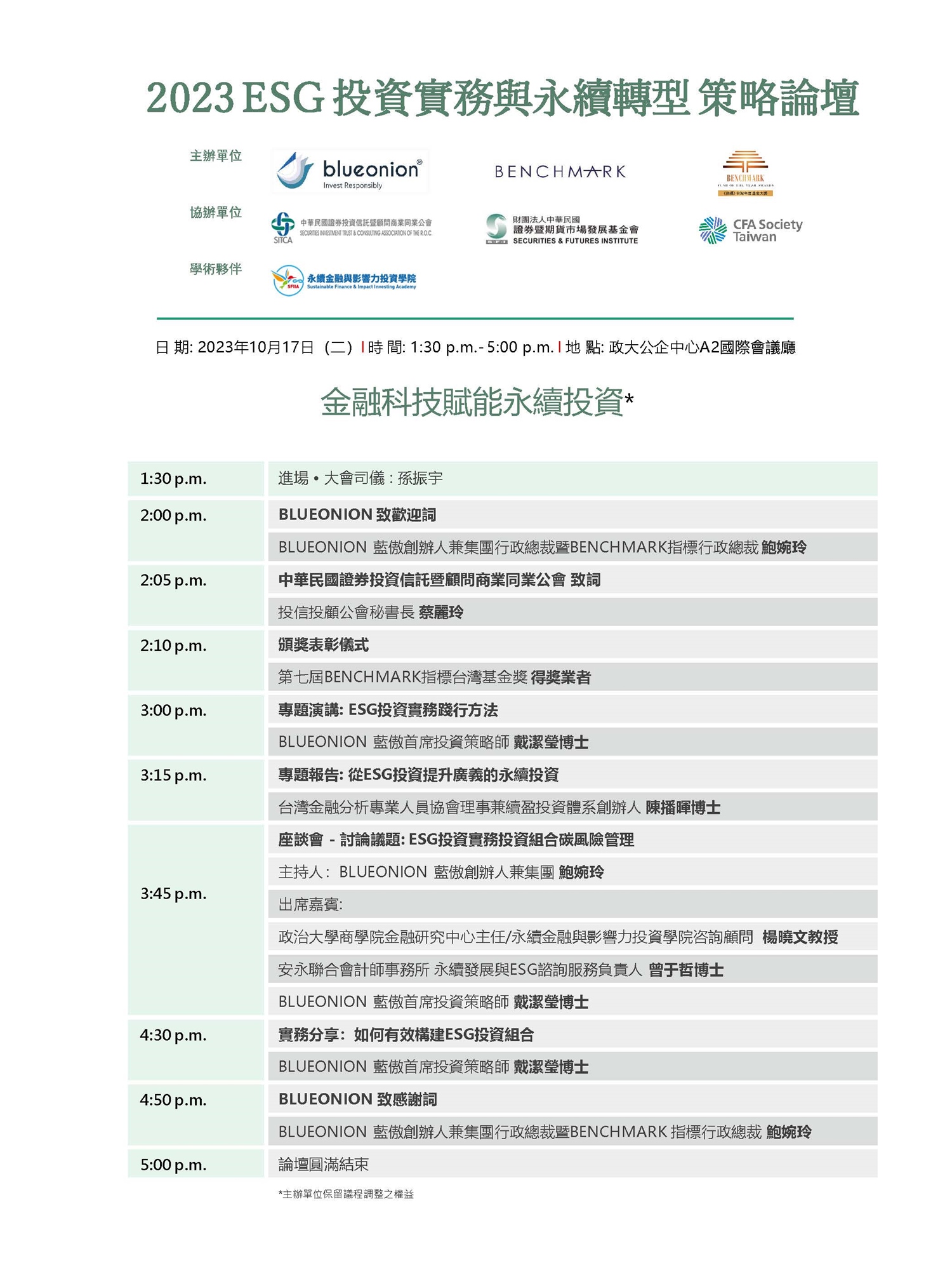 此次活動受到投信投顧公會、證基會、CFA協會台灣的協辦支持,永續金融與影響力投資學院擔任學術夥伴。活動致力推動ESG投資實務分享,為金融從業者提供ESG整合、投資組合管理、永續轉型策略等多方面的實操分享。希望與參會業者共同推動社會責任和環境影響,促進金融生態系統正向循環,實現金融生態的永續影響力,論壇活動具有ESG教育訓練意義,免費出席。歡迎投信投顧業者、銀行業者、證券期貨業者以及金融從業者踴躍報名。