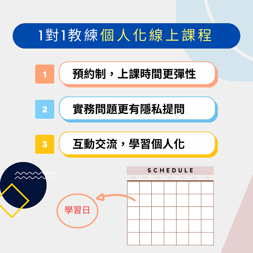 ※採1對1教學,需先預約時間。學習更有隱私,可將實務面遇到的問題先留言在報名表