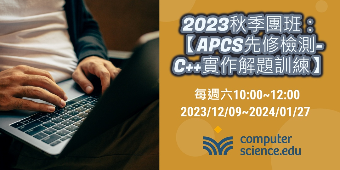 2023/12/09(六)~2024/01/27(六) 每週六上午10:00~12:00 上課,每週1堂,共8堂課。課程內容:APCS第二大題實作題範圍,需有C++基礎。