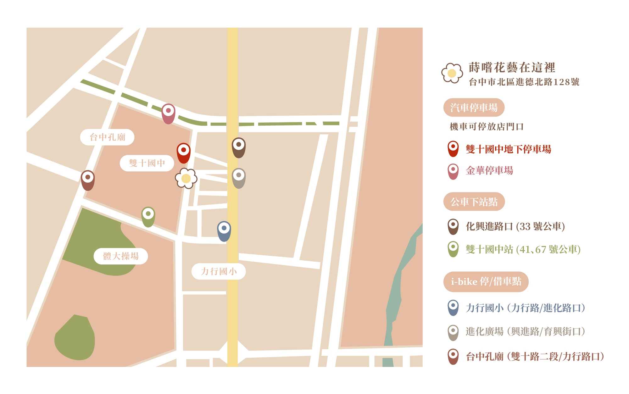41 、67 公車 於雙十國中站 下車 步行約5分鐘