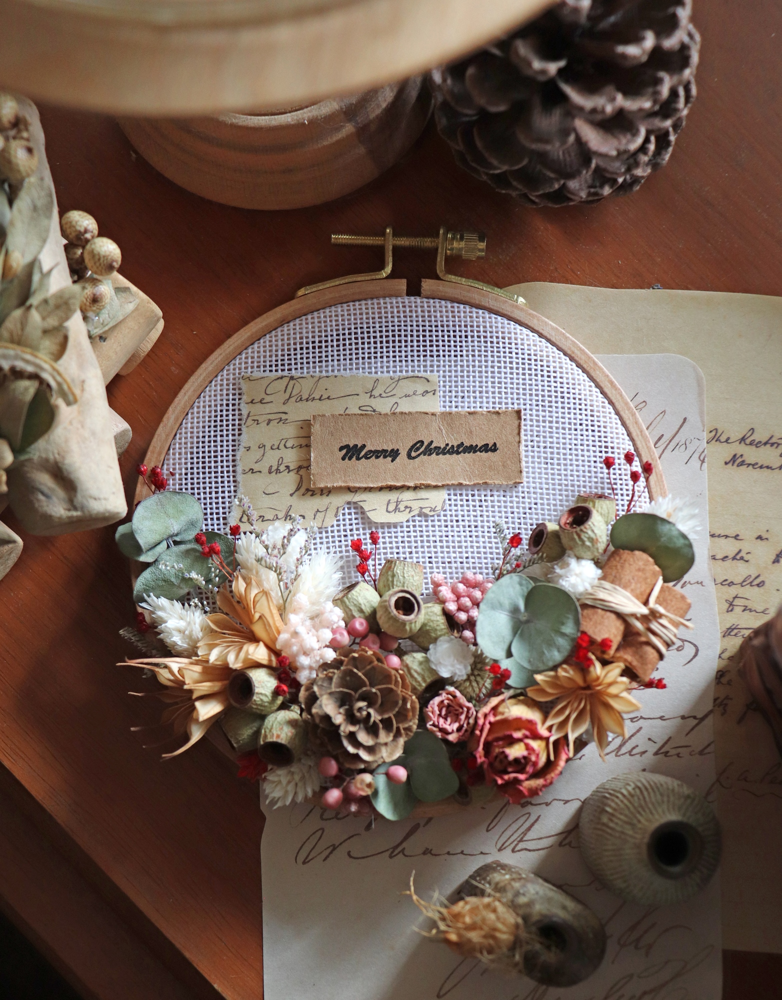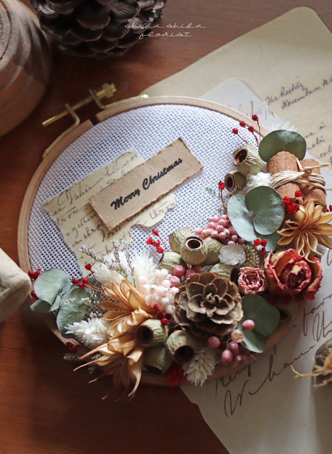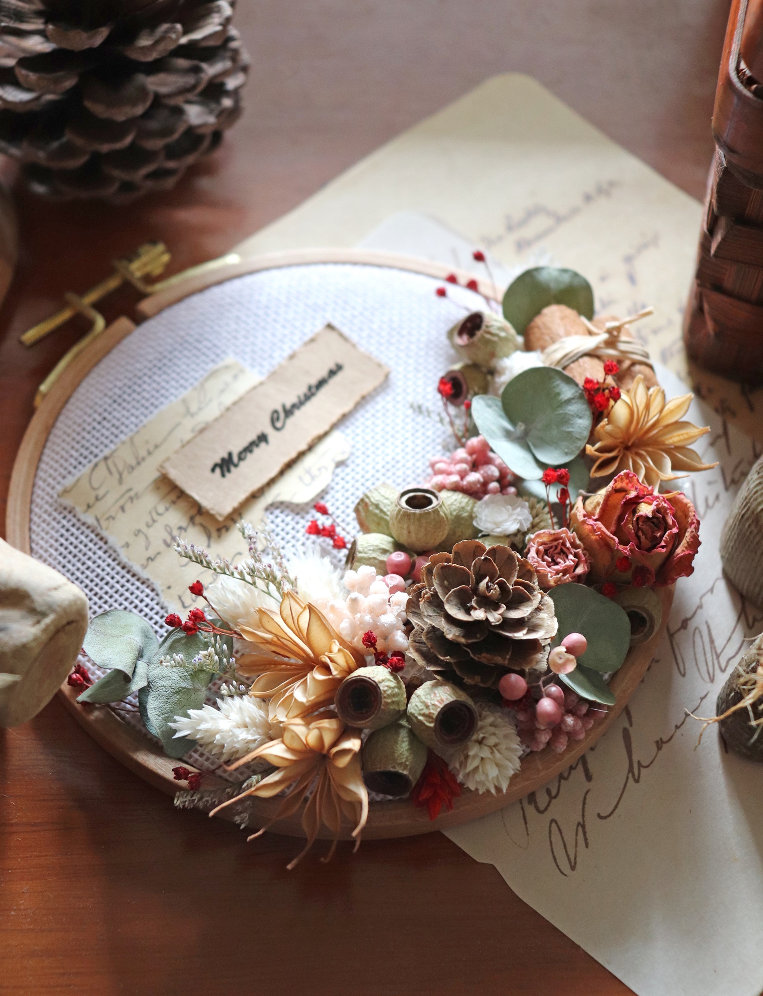 刺繡繡框與乾燥花結合