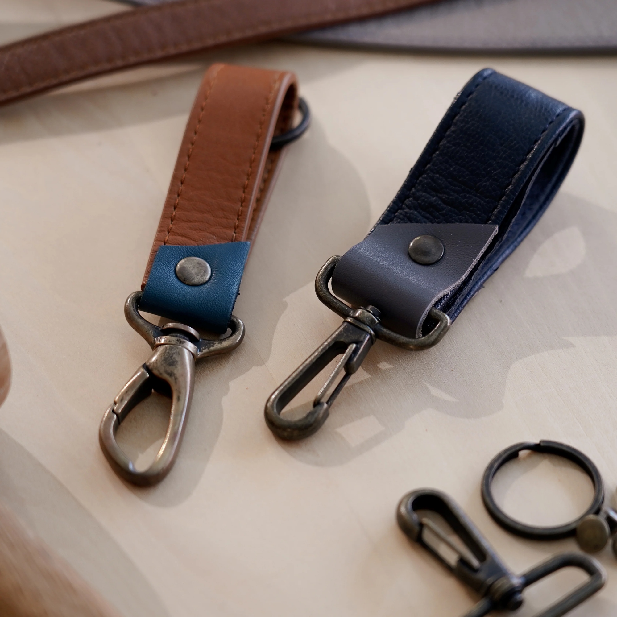 永續也可以很時尚!以回收包包的背帶為素材,挑選自己喜歡的配色,製作出獨一無二的皮革鑰匙圈。