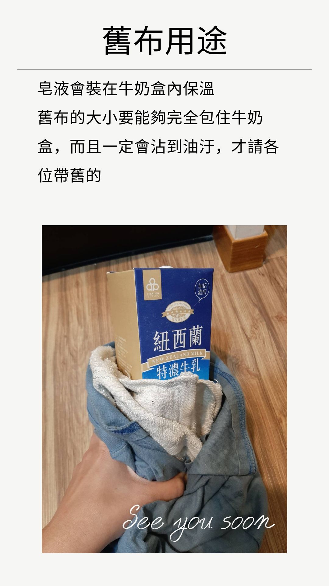 ▎注意事項:需自備 刮刀、打蛋器、長型牛奶紙盒一個(請晾乾勿壓扁)、直徑18-20公分的不銹鋼鍋一個,中小型環保購物袋一個(提牛奶紙盒回家用的,不需要太大要不然會翻倒),舊浴巾或舊衣一件(保溫成品用),並請佩戴『眼鏡或護目鏡』,若您的服裝比較怕弄髒,可以多帶一件圍裙保護喔。