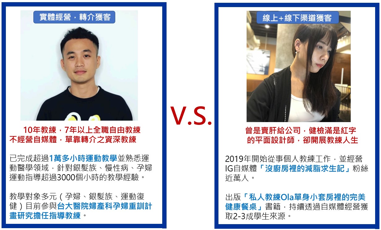 他們在自身教練職涯均積累多年豐厚的資歷,他們分別透過實體人脈經營、自媒體行銷等多種渠道持續獲取客戶,而且不論在疫情前、後均展現優秀的「獲客能力」,學生依舊滿滿,並建立更多元的人脈渠道、收入結構。