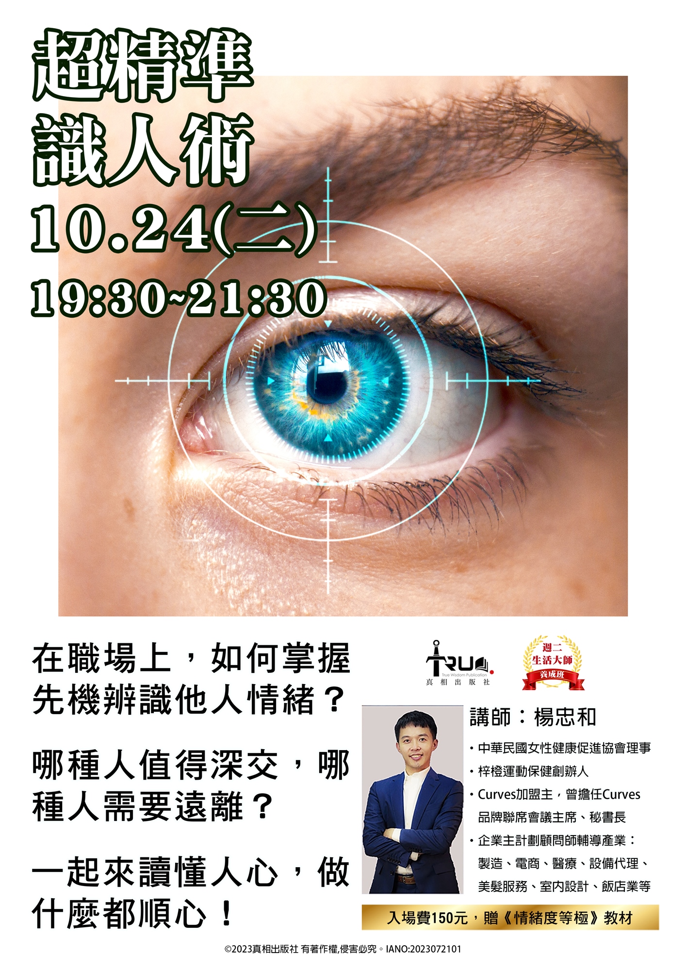 💖讀懂人心,做什麼都順心, 升級職場A咖必學讀心超能力!此講座教你如何觀察微表情、不錯放小動作,讓你暗箭易躲,免受騙.不再吃悶虧!為順遂人生鋪好路!
