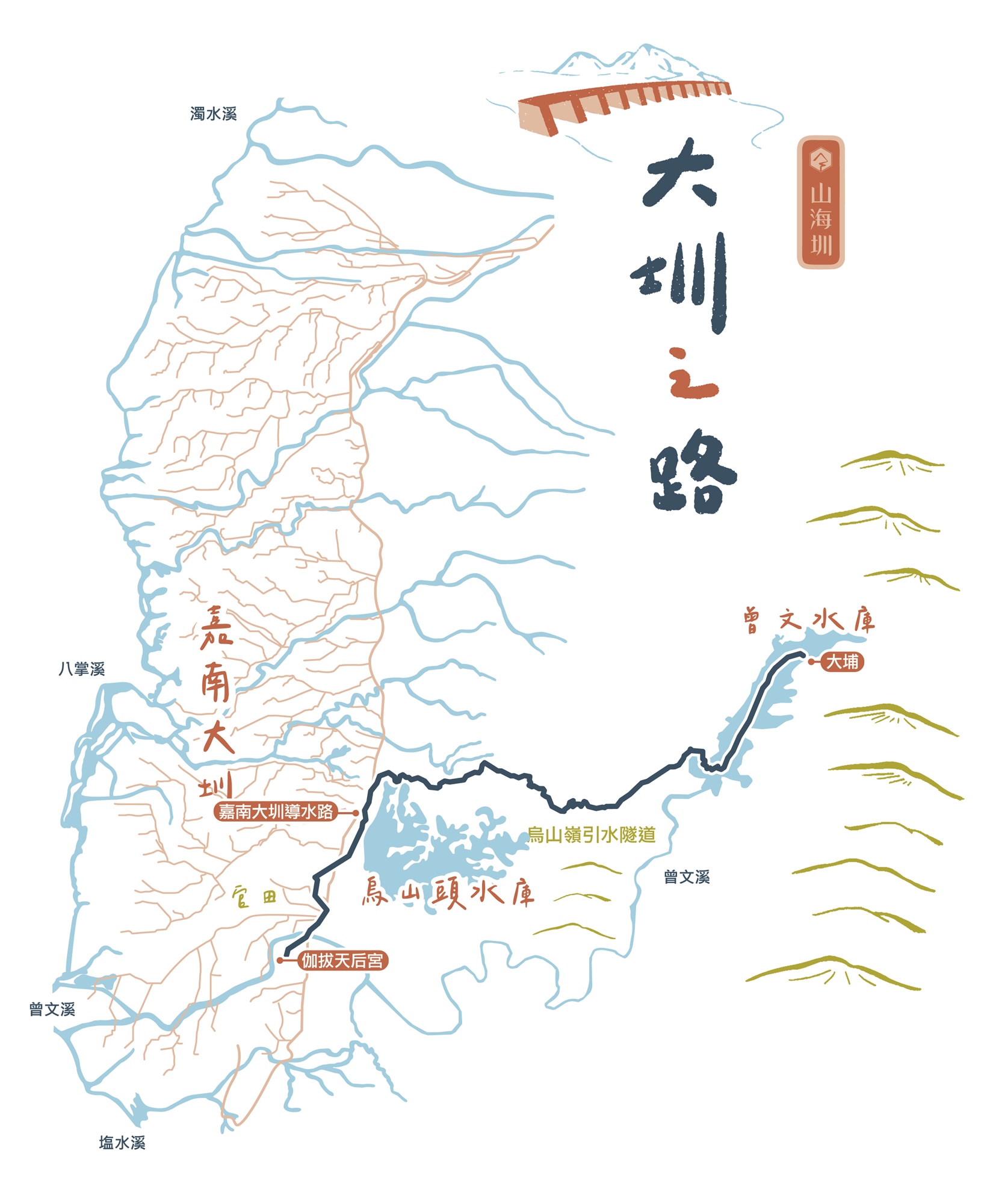 「山海圳國家級綠道」橫跨範圍廣大,其自然景致、歷史人文、觀光元素豐富,其中的「大圳之路」更觸及當年蔚為全球三大水利工程之一的烏山頭水庫!透過約7公里左右的健行路線,讓人以最舒服的速度,來一場與在地的深度旅遊,體驗仙境西拉雅的力與美。